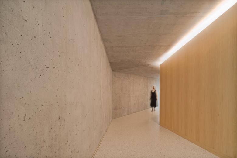 Sichtbeton an Stützwand und Decke, Terrazzo mit regionalen Zuschlagstoffen am Boden sowie eine warme hölzerne Schale aus heimischer Weißbuche prägen die innere Gestalt.
