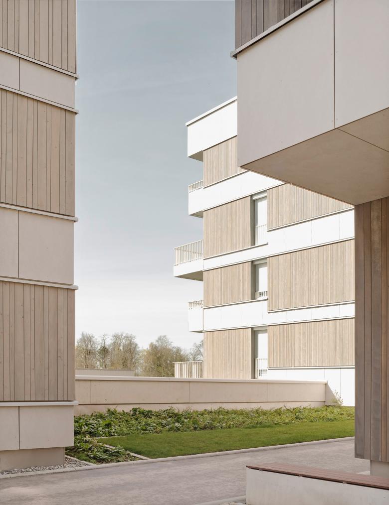 Die vier Gebäude gliedern sich durch eine geschossweise ausgebildete, kräftige horizontale Bänderung. Unterschiedliche Brüstungshöhen erzeugen ein abwechslungsreiches Fassadenbild. Die Vielfalt und Differenzierung der Häuser wird dabei durch eine unterschiedliche Farbigkeit der vorvergrauten und hinterlüfteten Weißtannenschalung unterstützt.