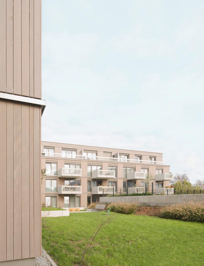 Hochgedämmte Holzfassaden mit hinterlüfteten, vorvergrauten Weisstannenschalungen bilden eine nachhaltige Fassadenbekleidung. Im Zusammenspiel mit Luft-Wärmepumpen und Photovoltaik erfüllen die Gebäude den KfW55-Standard.