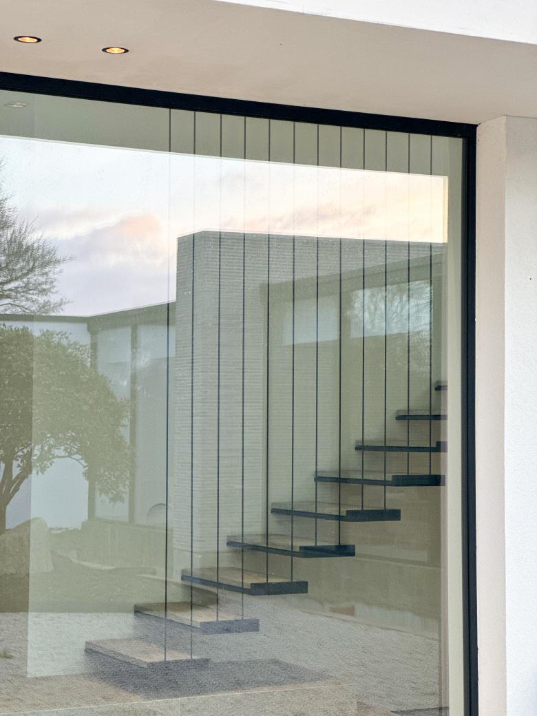 Das Einfamilienhaus entsteht auf einem 5000qm großen Grundstück mit Waldrandlage. Es entsteht ein Ensemble aus Architektur und Aussenraumgestaltung. Der Baukörper breitet sich pavillonähnlich auf dem Grundstück aus und schafft Innen und Aussenräume die fließend ineinander übergehen. Der repräsentative Bereich des Hauses bettet sich wie ein Steg zwischen die großzügig angelegten Teichflächen. Von diesen Räumen aus eröffnet sich der Blick in Richtung des Waldes und dem Patio der von einer Showgarage gefasst wird.