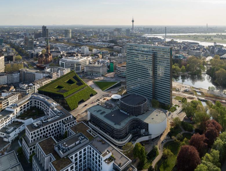 Der zweiteilige Geschäfts- und Bürobaukörper Kö-Bogen II entsteht am Gustaf-Gründgens-Platz in direkter Nachbarschaft zu den Architekturikonen Dreischeibenhaus und Düsseldorfer Schauspielhaus. Durch seine verschiedenen Bauhöhen reagiert der Neubau von ingenhoven architects auf den umliegenden Baubestand und gewährt einen öffnenden Blick auf die denkmalgeschützten Solitäre und den dahinterliegenden Hofgarten. Die Dächer und Fassaden des Ensembles sind intensiv begrünt und lassen ein neues grünes Herz in der Düsseldorfer Innenstadt entstehen. Nachhaltige Architektur zu schaffen, ist für ingenhoven architects eine Selbstverpflichtung. Der Kö-Bogen II erhielt bereits die höchste Auszeichnungsstufe DGNB-Platin als Vorzertifikat.
