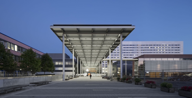 Die jüngste Maßnahme am Universitätsklinikum ist die Sanierung der Bettenhausscheibe und des Zentralgebäudes Haus 23 bei laufendem Betrieb. Die weithin präsente Bettenhausscheibe sollte nicht nur die energetischen Erfordernisse erfüllen, sondern auch zeitgemäßen gestalterischen Ansprüchen gerecht werden. Die Erneuerung der Fassade des im Betrieb befindlichen Bettenhauses bildete eine logistische Herausforderung und erforderte, wie auch die Maßnahmen in den Sockelgeschossen, vielfältige Interimslösungen. Die Sockelgeschosse wurden vollständig entkernt und durch einen Neueinbau vervollständigt. Hierin befinden sich drei Zentren der inneren Medizin und eine Unfallchirurgie. Die neue Eingangshalle bildet die Schnittstelle zwischen Universitäts- und Krankenhausbetrieb sowie zwischen Neubau und Bestand, beinhaltet die Service- und kommunikativen Einrichtungen und leitet Patienten und Besucher über die eingegliederten Magistralen in das Gebäude.