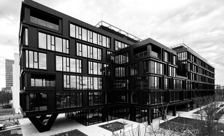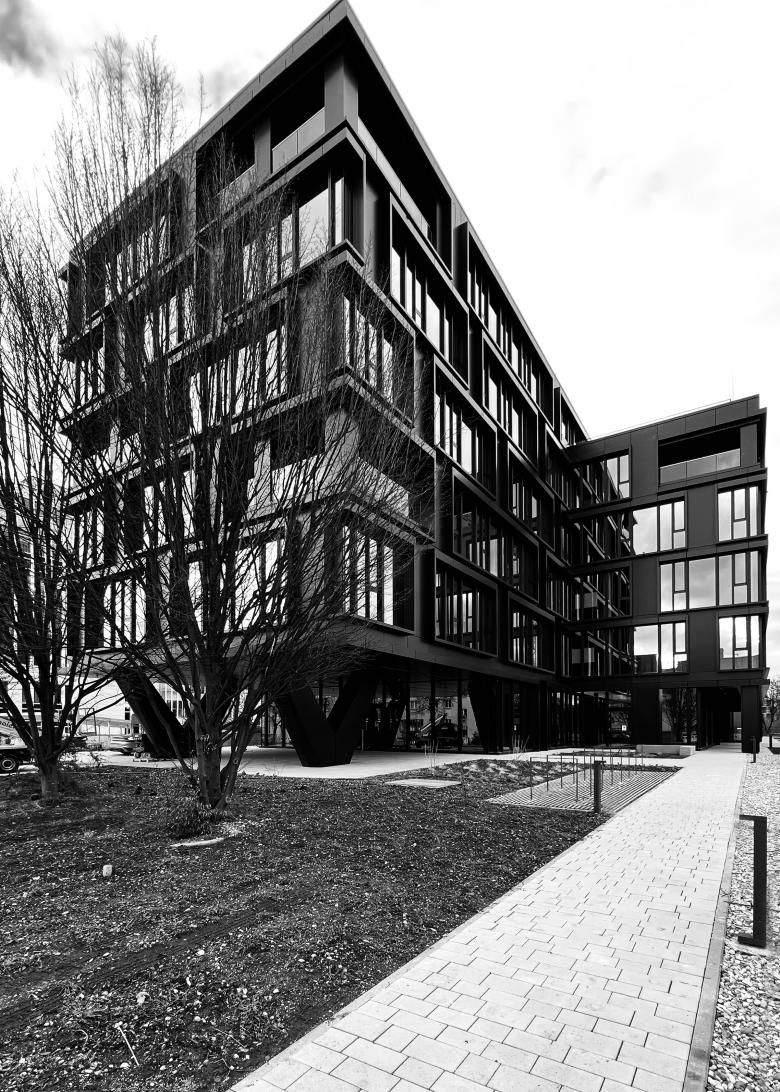 O S A Ochs Schmidhuber Architekten hat im Münchner Westend ein elegantes, zeitloses Bürogebäude für die Deutsche Finance Group realisiert. Das Viertel, nahe des angrenzenden Westparks, befindet sich im steten Wandel. Daher entstand der Plan, auf einer Brachfläche ein zukunftsweisendes Bürogebäude im Grünen zu bauen. Der Bau trägt eine weitgehend gläserne Fassade, so entsteht ein schlanker, schwarzer Baukörper, Loggien und Terrassen sind auf allen Etagen vorhanden. Auf ins Freie.
