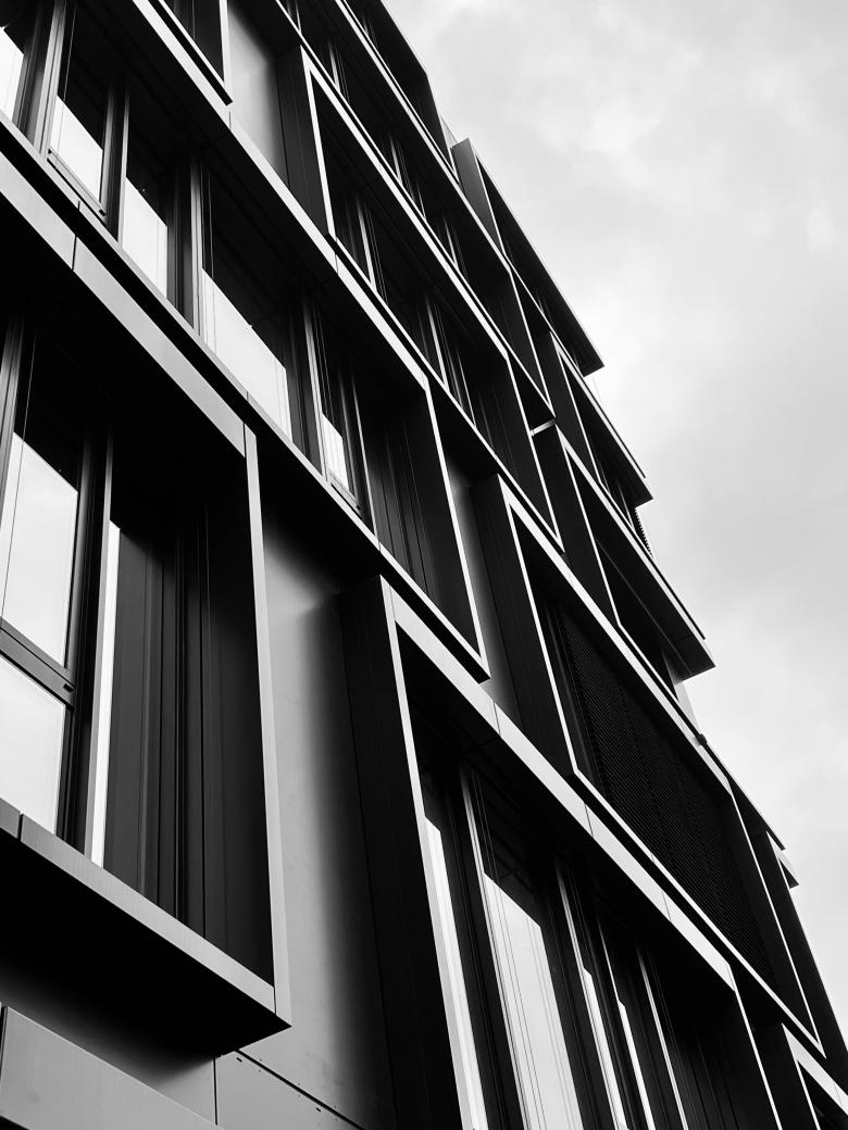 Die Fassade, als Elementfassade einem schlanken Stahlbeton-Skelettbau vorgehängt, besteht aus Glas und einer schlanken Rahmenkonstruktion aus mattschwarzem, pulverbeschichtetem Metall. Dies hebt durch Glas und opake schwarze Elemente das Wechselspiel zwischen Offenheit und Geschlossenheit hervor. Glas und Metall stehen einerseits im Kontrast zueinander und verbinden andererseits die Transparenz mit dem soliden Gesamteindruck des Gebäudes. Einzelne Module rhythmisieren die Fassade. Auf allen Etagen gibt es Loggien und Terrassen, die sich ins Freie öffnen und das starre Raster der Fassade auflösen.