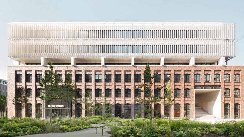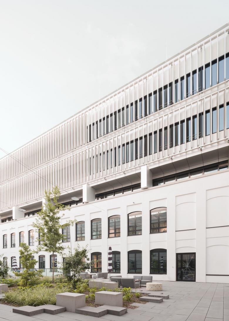 The division of the architecture into two parts mixes old and new: while the reddish-brown base area with its ventilated brick façade is reminiscent of classic industrial architecture, the visually light extension with its metal element façade and external sun protection slats stands for progress and the future.