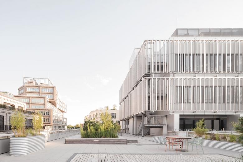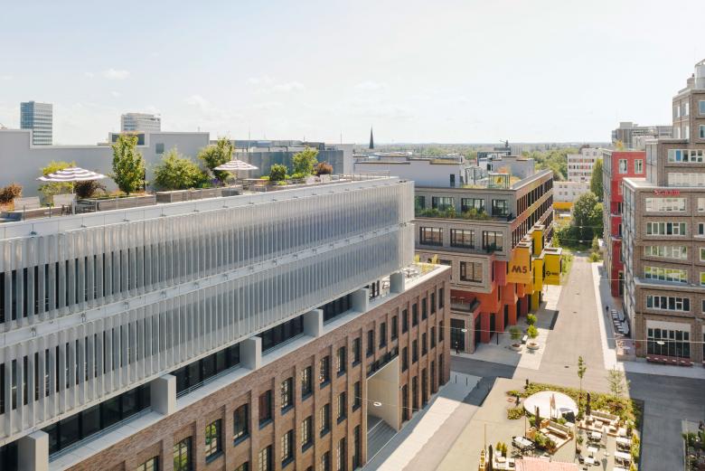 The incubator is planned as a classic block with an internal courtyard. The building is divided into two parts: It consists of the three-storey base, which comprises the first floor, second floor and second floor. The fourth storey lies on top of this as the basis for the striking two-storey steel and glass corpus above with a flexible lamella structure made of metal, glass and expanded aluminum. The rhythmic structure of the Incubator creates large terraces with plenty of open space, greenery and wide views.
