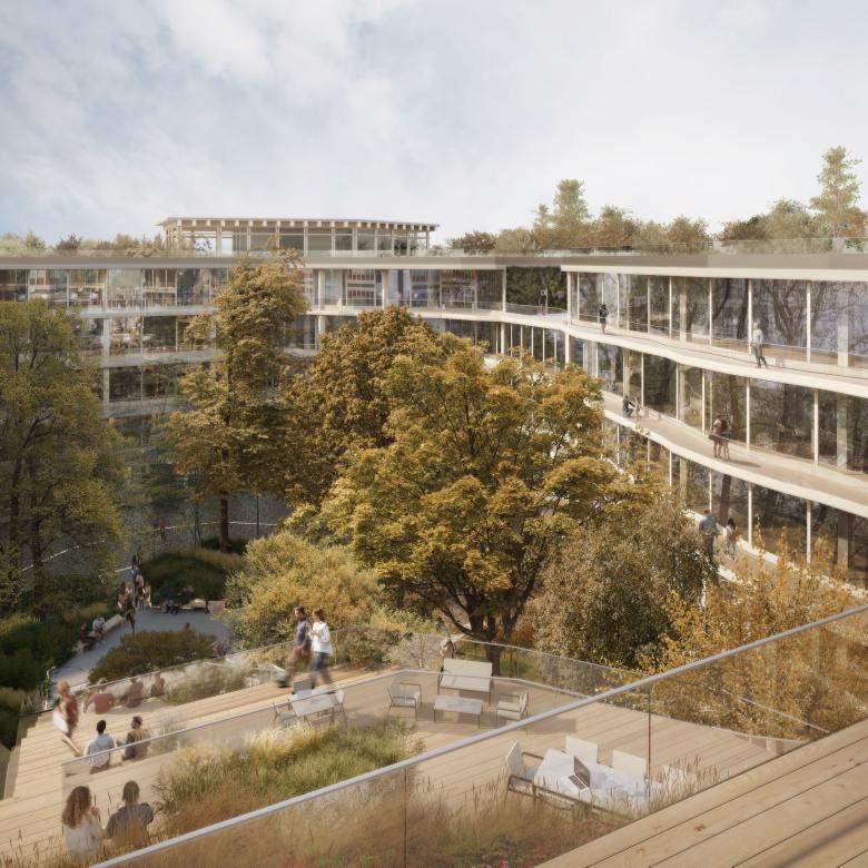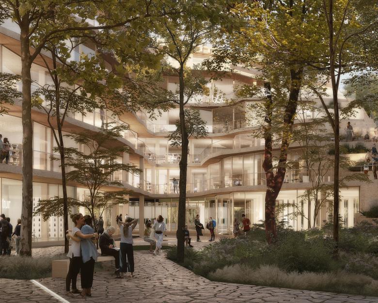 Three axes divide the quarter into five individual blocks, thereby opening out the central green area to the local public as well. Entering the inner courtyard, the architecture reveals an organic canyon-like topology. Cascades at the east side connect all six floors and are continued by generously laid out terrasses, balconies and arcades. With regards to our responsibility towards sustainability, the quarter sets new standards in Berg-am-Laim, meeting the current demands. A hybrid timber construction reduces the amount of reinforced concrete to its minimum. The energy supply and management systems developed by ARUP consist of photovoltaic elements, air pumps and intelligent water circulation systems. It sets the framework for an efficient day-to-day use of the building.