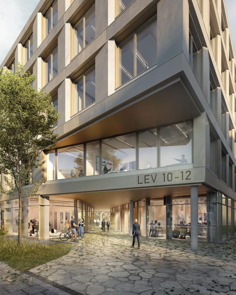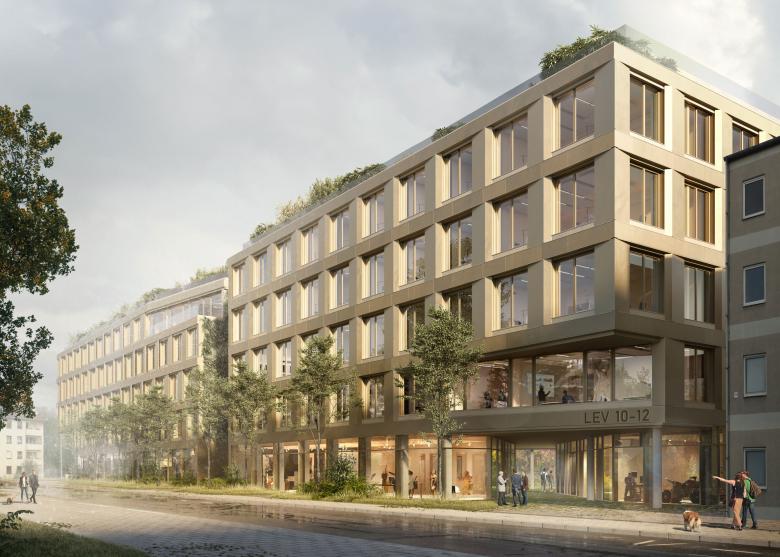 Together with Neuplan, we are developing a modern and sustainable quarter in the east of Munich, just a few steps away from our Macherei. Along Levelingstraße, the L-shaped architecture presents itself with a well-structured and clean facade.