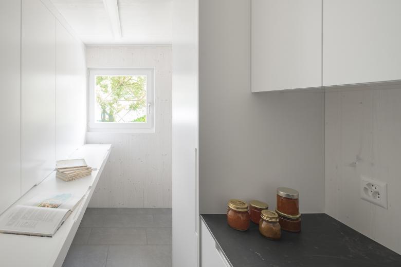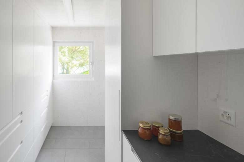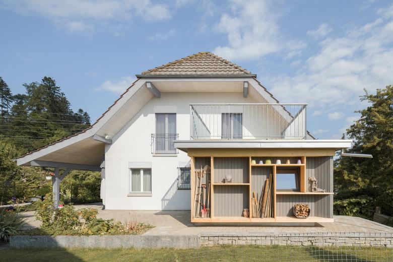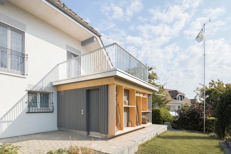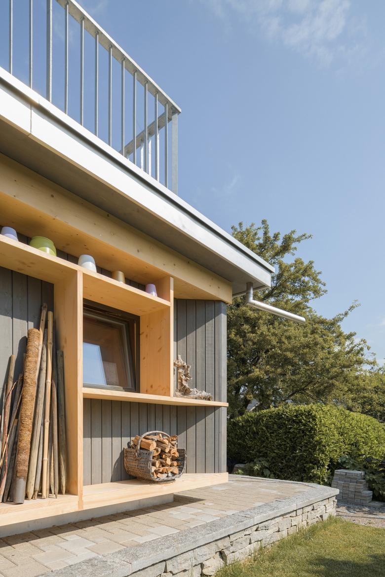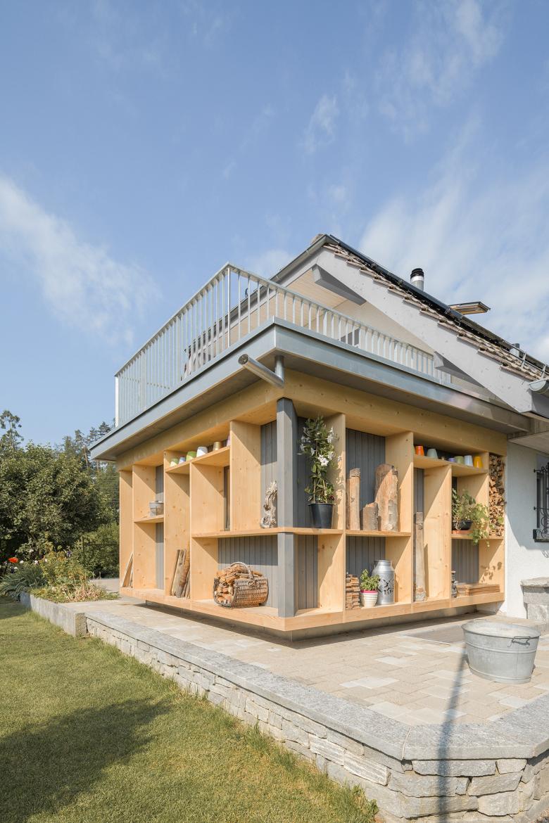 Anbau als "Setzkasten" in Holzbau für Erweiterung Küchennutzung und Gartengeräte.
