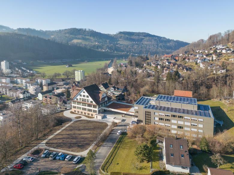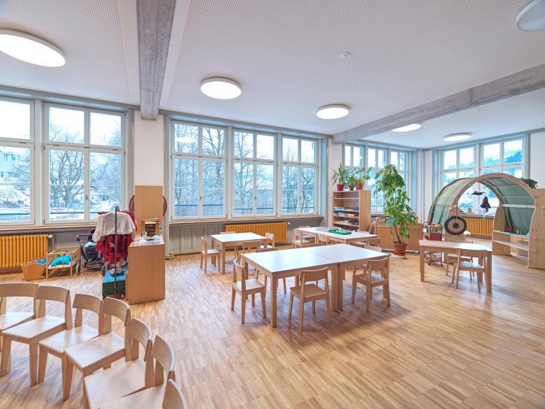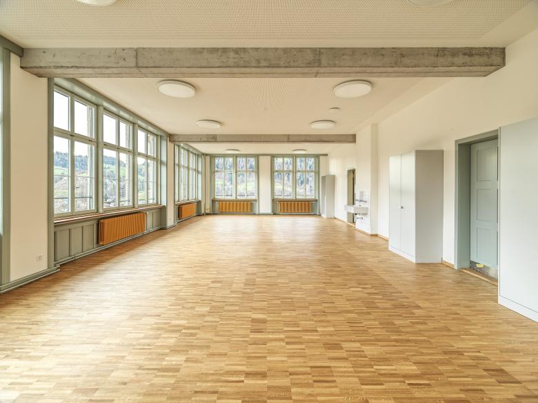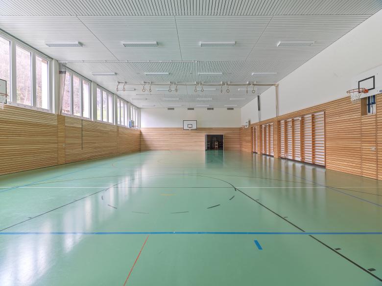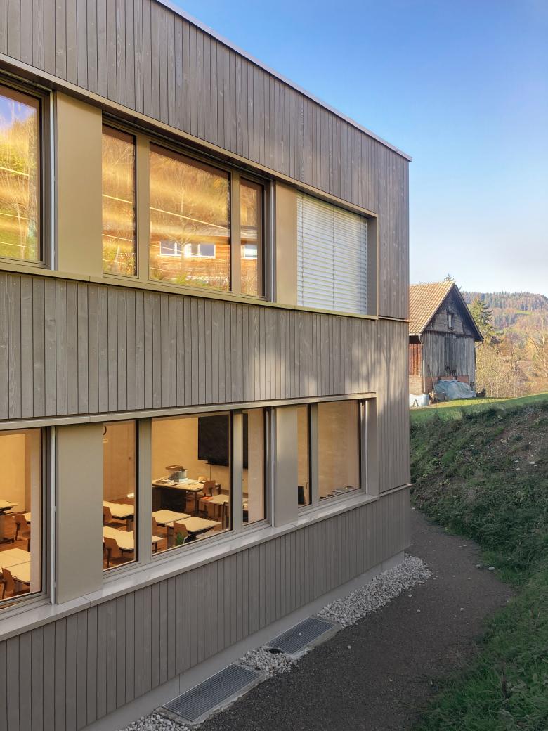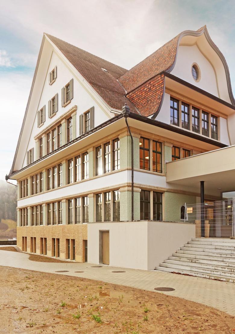 Die Schulanlage Risi - bestehend aus zwei Gebäudetrakten, welche im Untergeschoss und mittels einer Überdachung miteinander verbunden sind - soll komplett saniert und umgebaut werden. Der ältere Trakt mit einem imposanten Kreuzgiebel stammt aus dem Jahr 1916 und ist denkmalgeschützt. Der grössere Erweiterungsbau wurde 1974 erbaut. Im Rahmen der Instandsetzung wird die Gesamtschule den heutigen Raumansprüchen angepasst und durch Kindergarten und Aula ergänzt. Für den Erweiterungsbau heisst dies, dass die bestehende Fassade aus vorgehängten Betonelementen durch eine neue, gedämmte und hinterlüftete Fassade ersetzt wird. Beide Trakte werden für eine hindernisfreie Erschliessung neu mit Liften ausgestattet und für die Erdbebenertüchtigung werden neue Erdbebenwände über alle Geschosse erstellt. Die Haustechnik wird komplett ersetzt und den heutigen Anforderungen angepasst. Das geforderte Raumprogramm benötigte neu eine Aula, Kindergartenräume, 14 Klassenzimmer mit Gruppe und Lernzonen, Handarbeit- und Werkräumen, Schulküche und Turnhalle. Die Grundrisse beider Gebäude wurden für grössere Räume neu strukturiert und eingeteilt. Die ehemalige Gymnastikhalle im 2. Obergeschoss wird zu einer Aula für 350 Personen umgebaut, welche durch eine mobile Trennwand auch in zwei Nutzräume unterteilt werden kann. Auch sämtliche Umgebungs- Spiel und Pausenflächen der Schulanlage werden neu konzipiert und gestaltet.