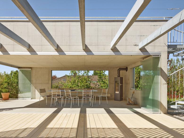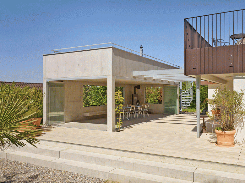 Der kleine, alte gedeckte Gartenpavillon war baufällig und verkommen, der Geräteschopf an der Südostecke versperrte die Sicht aus dem Wohnzimmer in den Garten. Dies war die Ausgangslage für die Planung einer grosszügigen Gartenhalle und neue Umgebungsgestaltung eines Wohnhauses mit zwei übereinander liegenden Wohnungen. Dem Wunsch nach direkten Ausgängen von Küche und Wohnzimmer konnte trotz den kleinen topografischen Versätzen des Gartens entsprochen werden durch ein neues, gross abgestecktes Holzdeck aus Acoyaholz. Dieses kann zusammen mit einer langen Stützmauer auf der Ostseite mit vorgelegten und vorgefertigten Betonstufen-Elementen und der volumetrischen Ausformulierung der Gartenhalle sämtliche funktionalen Ansprüche an Gebäude und Umgebung erfüllen. Die Gartenhalle ist als Verlängerung des Wohnraums interpretiert und öffnet sich maximal zur Gebäudeseite und Aussengrillfläche hin. Zum begrünten Garten und den Buschbereichen öffnen sich präzis gesetzte, fixe Fensteröffnungen, welche vom Innenraum einen rahmenlosen Blick in den Garten ermöglichen. Eine raumhohe, verschiebbare und einfach zu bedienende Verglasung (Nucovista), lässt zusammen mit dem Cheminée eine ganzjährige Nutzung zu und schützt den gedeckten Sitzplatz vor Wind und Sonne. Auf dem Dach der Gartenhalle ist ein grosszügiges Sonnendeck platziert, ebenfalls mit Holzboden und entsprechenden Wasser und Stromanschlüssen für eine möglichst vielfältige Nutzung. Hier öffnet sich der Blick über Felder, Wälder bis hin zu den Alpen. Die Erschliessung erfolgt über eine Wendeltreppe in feuerverzinktem Stahl im Nordosten. Der Zwischenbereich Wohnzimmer zu Gartenhalle ist als Pergola ausgebildet, welche künftig mit Pflanzen überwachsen werden wird.