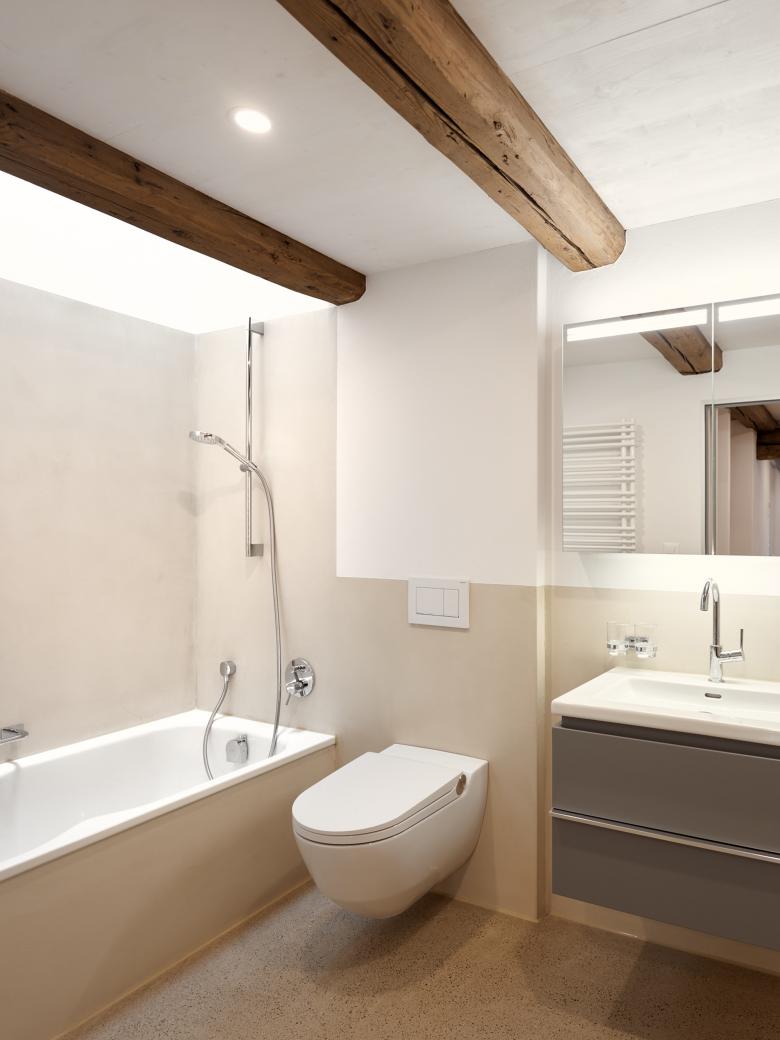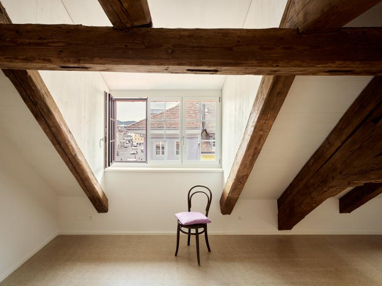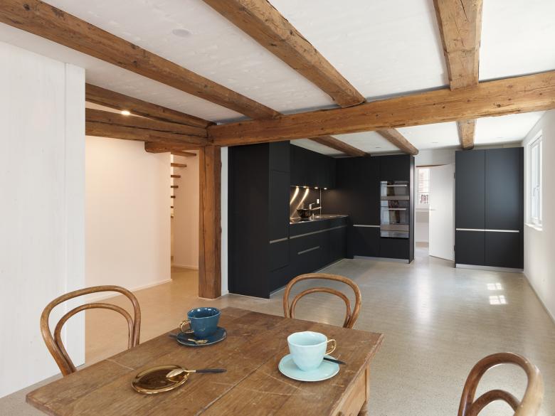 Der Umbau des denkmalgeschützten Winterthurer Altstadthauses an der Ecke Obergasse– Holdergasse steht mit seiner Hauptfassade zur Steinberggasse hin. Der Gesamtumbau umfasst die beiden Ladenlokale im Erdgeschoss, die beiden Wohnungen der Obergeschosse, sowie den Ausbau des Estrichs zu einer dritten Wohnung. Die bestehende Erschliessung konnte durch brandschutztechnische Auflagen nicht mehr erhalten bleiben und musste neu konzipiert werden. In Absprache mit der Nachbarliegenschaft konnte deren Treppenhaus durch Durchbrüche auf allen Geschossen mitbenutzt werden und im Bereich des ehemaligen Treppenhauses im Haus konnte eine gemeinsame Liftanlage erstellt werden. Die kompakten Geschosswohnungen können so maximal ausgenutzt werden, anstelle der ehemaligen Treppe sind nun Entree, Garderobe und Vorbereich zu den vier Zimmern und zum Bad möglich. Der Vorraum wird indirekt über die Glastür des Bades und den offenen Durchgang zum Wohnraum natürlich belichtet. Der nach Südwesten zur Steinberggasse hin ausgerichtete Wohnraum wird vergrössert und mit einer Küchenzeile ergänzt. Die bestehenden Wandtäfer und Deckenstukkaturen werden restauriert, der bestehende Mittelfries-Tafelparkett geschliffen und geölt und wo nötig ergänzt. In einer zweiten Etappe wurde der 3-geschossige Estrich zu einer Maisonette-Wohnung mit 5 Zimmern ausgebaut und mit neuen Dachgauben und Dachflächenfenstern belichtet.