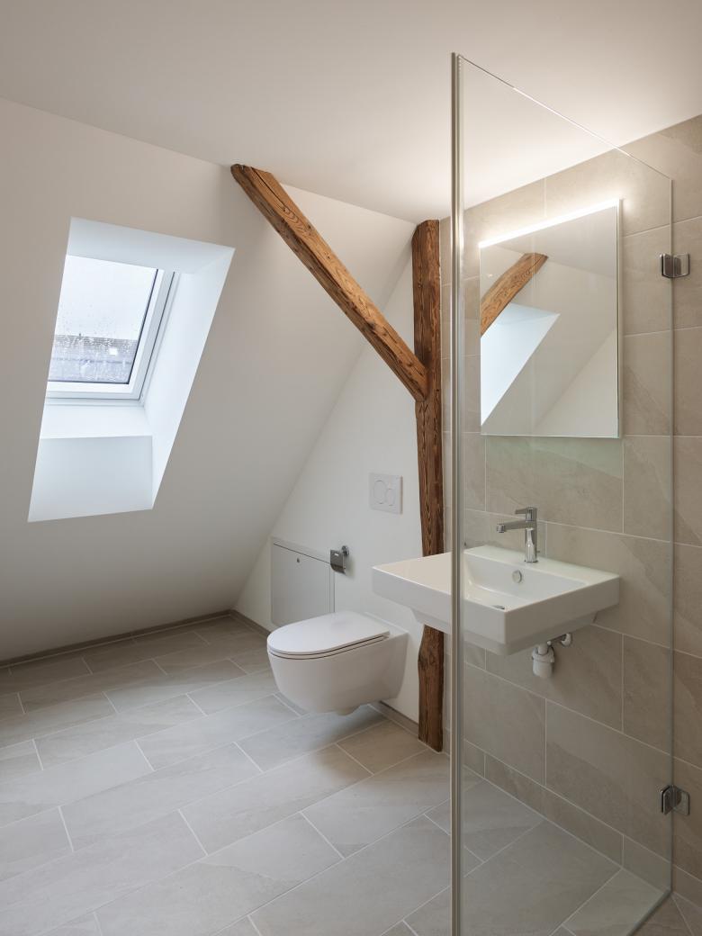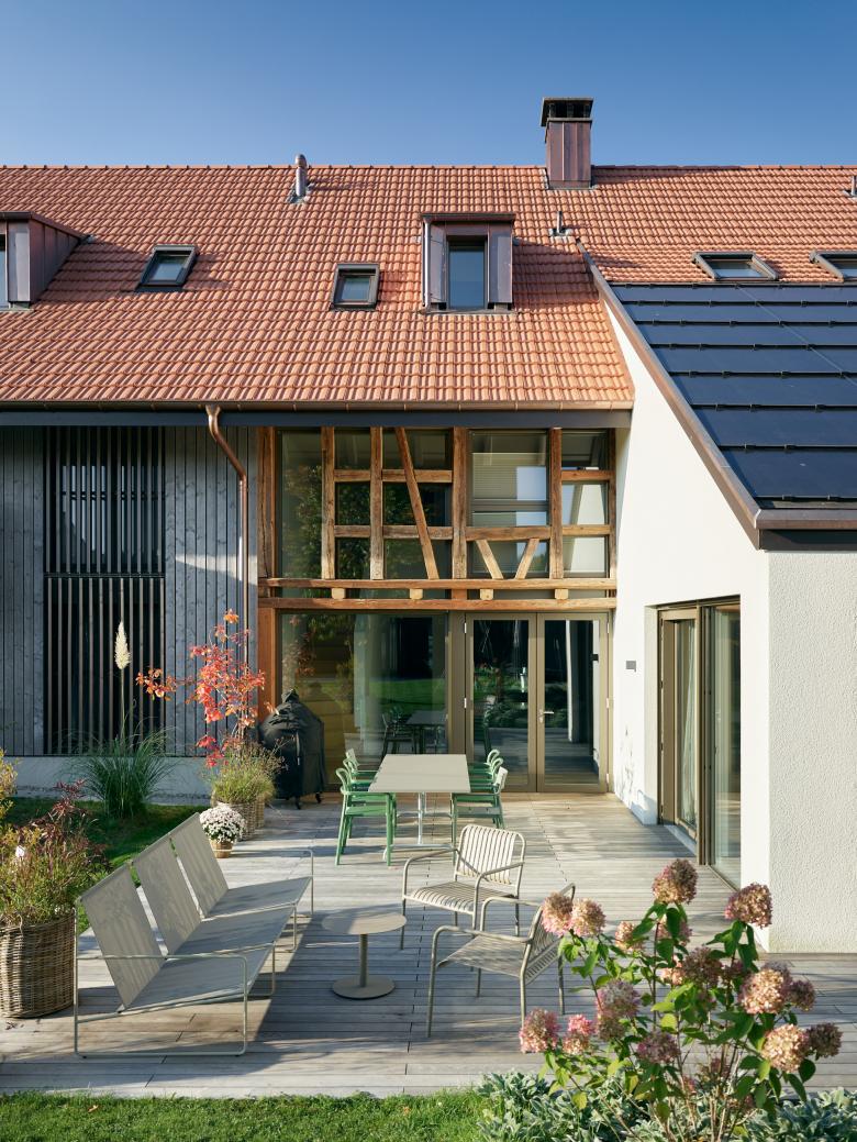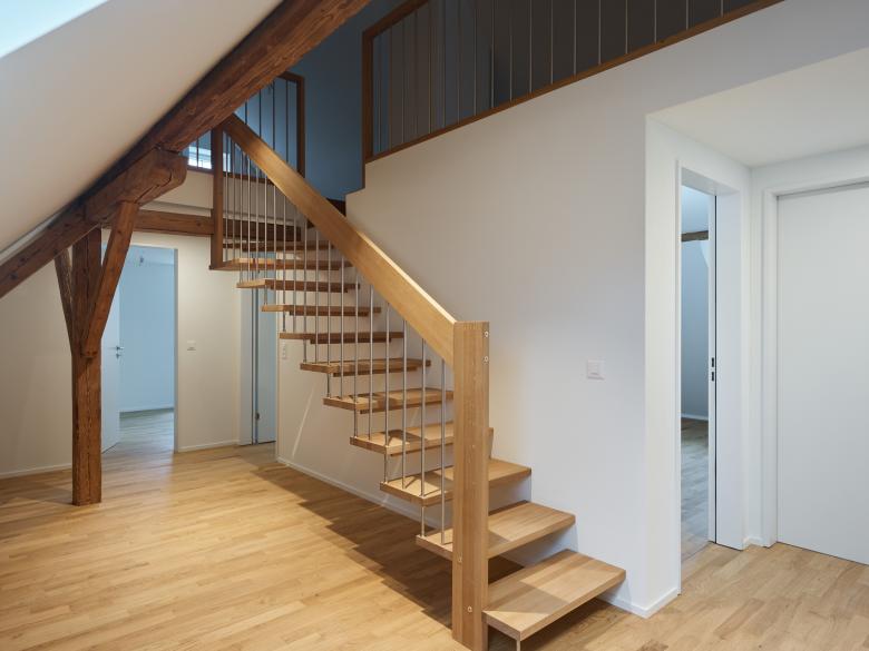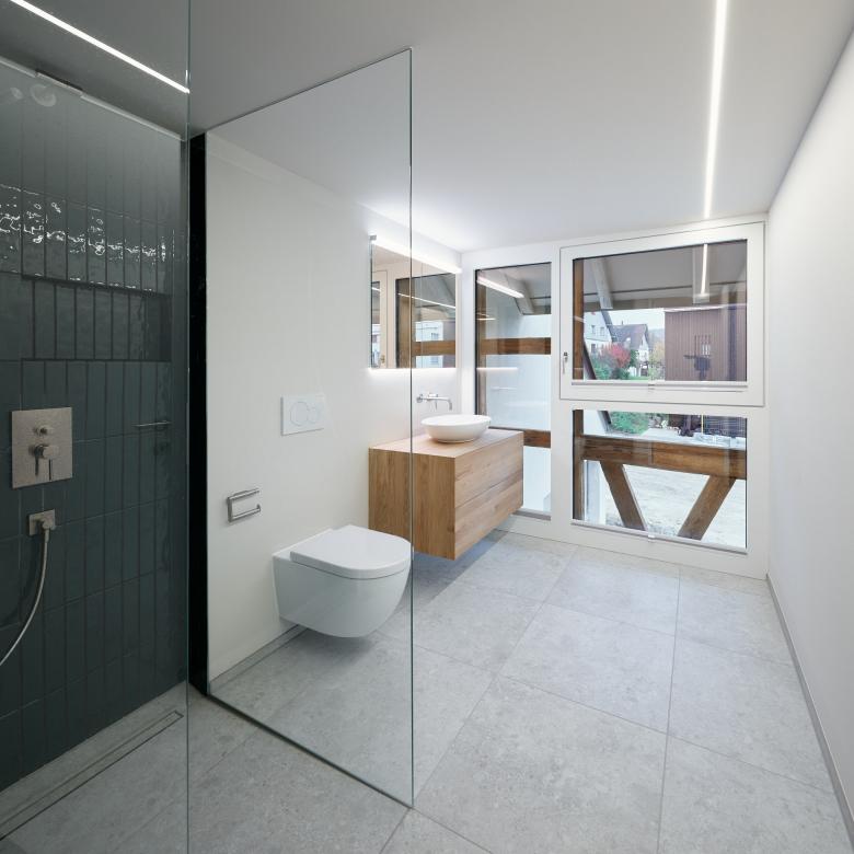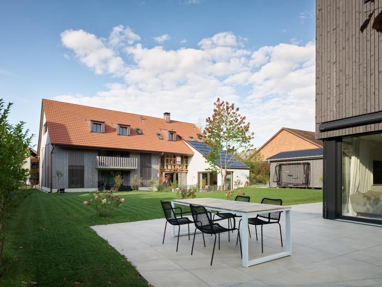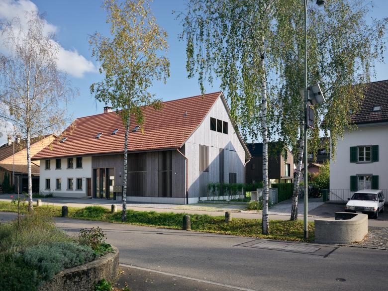 Das denkmalgeschützte Bauernhaus im Ortskern von Wiesendangen besteht aus Wohnteil, Tenn und Scheune. Da das Holztragwerk der Scheune aus konstruktiver und statischer Hinsicht nicht erhalten werden kann, wird stattdessen ein Ersatzneubau in gleicher Volumetrie mit drei Wohnungen erstellt. Damit sich der Ausdruck dieses Gebäudeteils gemäss den Auflage des Ortbildschutzes an der ursprünglichen Scheune orientiert, wird es mit einer vertikalen hinterlüfteten Holzschalung verkleidet. Durch bewegliche Holzlatten im Bereich der Fenster kann der Ausdruck mehr geöffnet oder geschlossen gehalten werden, . Ausnahmen bilden hier der Eingang zu den Wohnungen auf der Nordseite mit einer grossen Eingangsverglasung (Anlehnung Tenntor) und die Terrassenfenster auf der Gartenseite zu Sitz-platz und Balkon und Loggia im Dachgeschoss. Der geschützte Wohnteil mit grossem Kachelofen, erhaltenswertem Wandtäfer und Wänden in Holzfach-