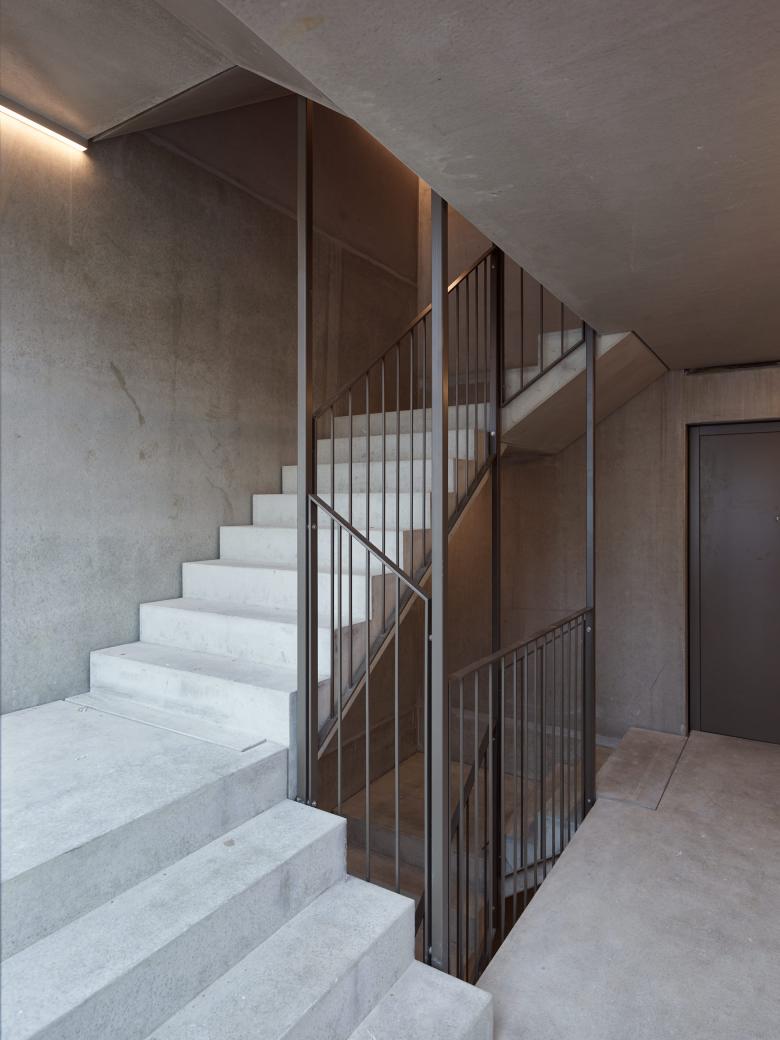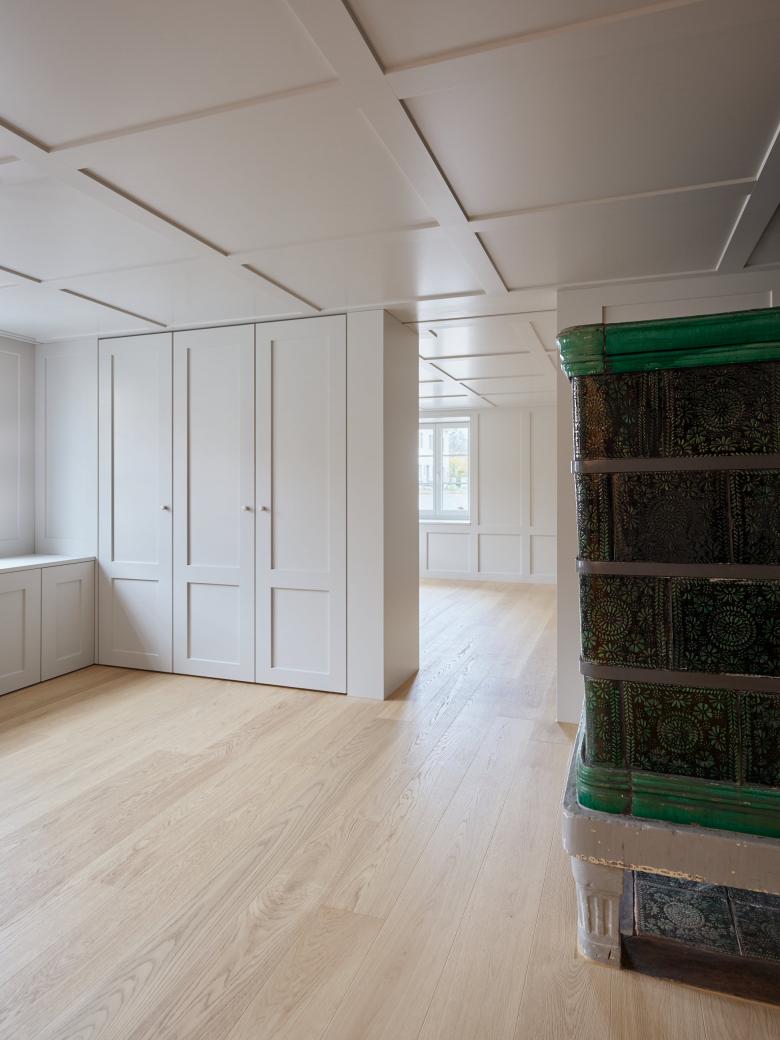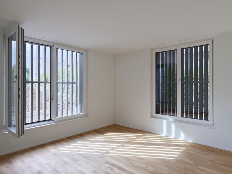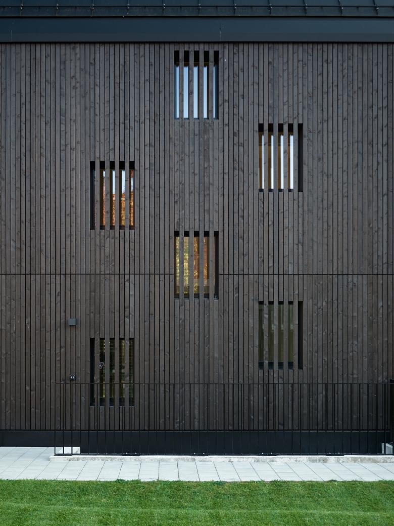 Das denkmalgeschützte Bauernhaus im Ortskern von Wiesendangen besteht aus Wohnteil, Tenn und Scheune. Da das Holztragwerk der Scheune aus konstruktiver und statischer Hinsicht nicht erhalten werden kann, wird stattdessen ein Ersatzneubau in gleicher Volumetrie mit drei Wohnungen erstellt. Damit sich der Ausdruck dieses Gebäudeteils gemäss den Auflage des Ortbildschutzes an der ursprünglichen Scheune orientiert, wird es mit einer vertikalen hinterlüfteten Holzschalung verkleidet. Durch bewegliche Holzlatten im Bereich der Fenster kann der Ausdruck mehr geöffnet oder geschlossen gehalten werden, . Ausnahmen bilden hier der Eingang zu den Wohnungen auf der Nordseite mit einer grossen Eingangsverglasung (Anlehnung Tenntor) und die Terrassenfenster auf der Gartenseite zu Sitz-platz und Balkon und Loggia im Dachgeschoss. Der geschützte Wohnteil mit grossem Kachelofen, erhaltenswertem Wandtäfer und Wänden in Holzfach-