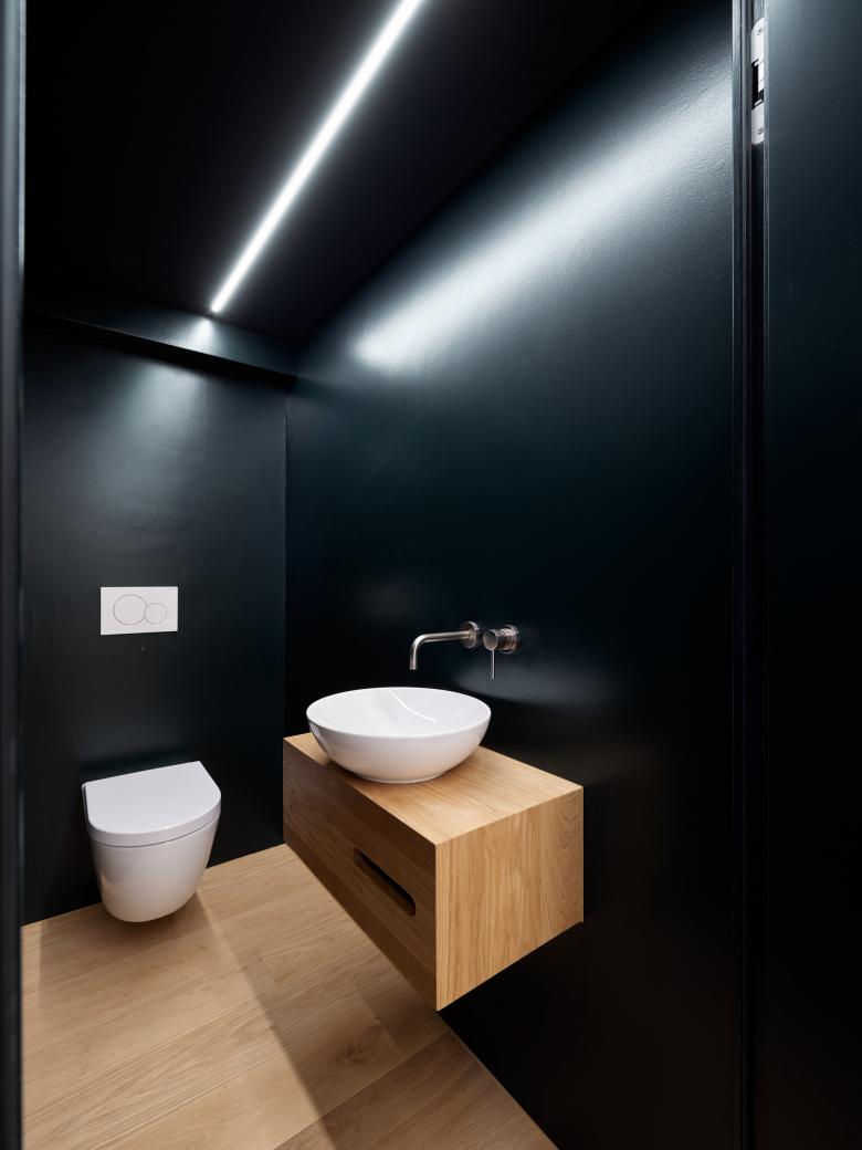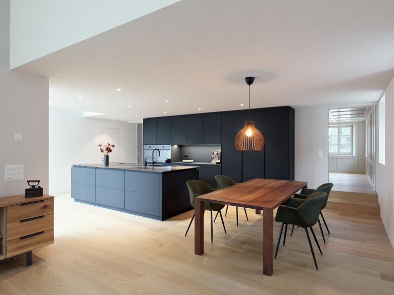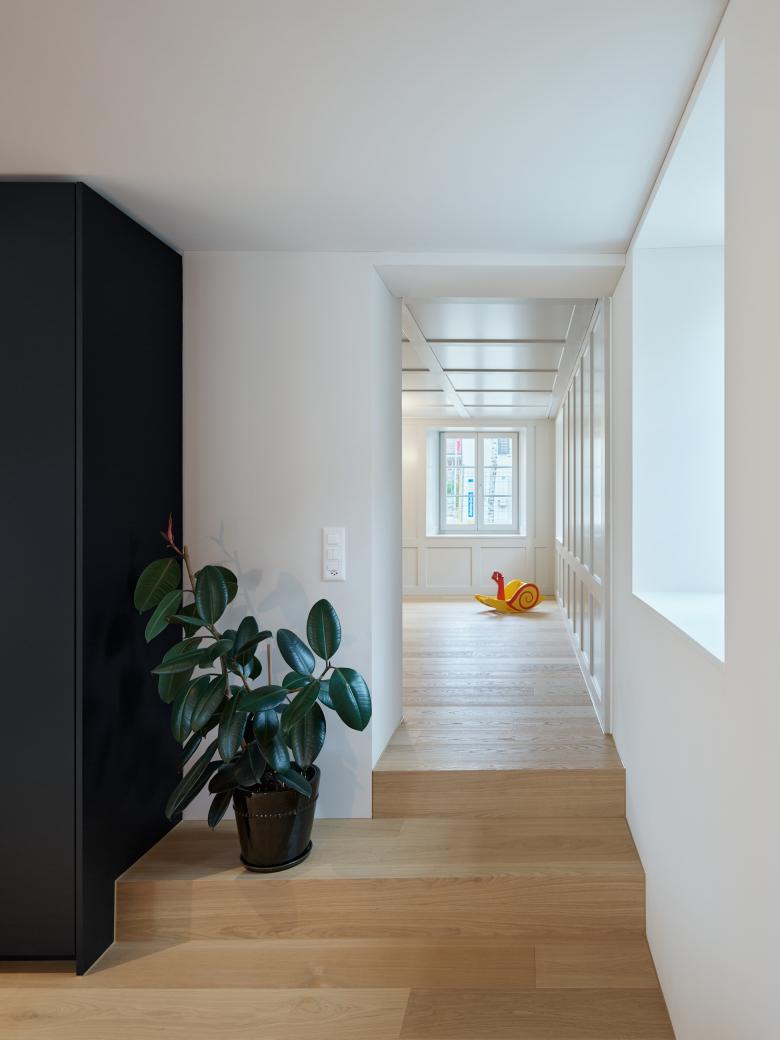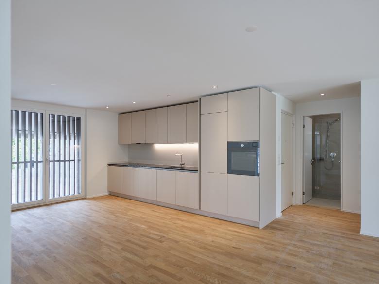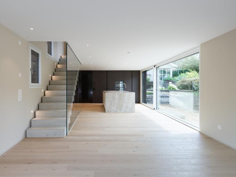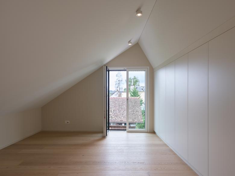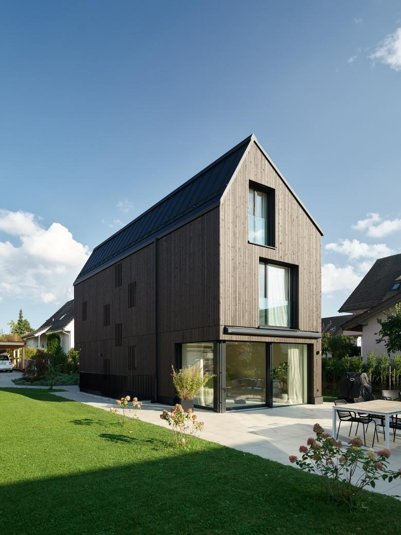 werk wird umgebaut und zur Gartenseite hin mit einem eingeschossigen Anbau erweitert. Dieser Anbau ist möglich, da bereits heute an dieser Stelle ein unbeheizter Anbau besteht. Neu wird vor allem die Südseite des Gebäude-teils umgestaltet, damit eine Wohnküche, Wohnzimmer und Treppe zu einem zeitgemässen Wohnbereich im Erdgeschoss zusammen-finden. Die Eingangstüre und Fenster der Nord- und Ostseite bleiben wie im Ursprung erhalten, die Südfassade wird geöffnet und erhält eine grosszügige Verglasung hinter den Fachwerkbalken aus Holz. Im Süden der Parzelle, vis-à-vis des Bauernhaus wird zudem auf einer kleinen Teilparzelle ein kleines, kompaktes Wohnhaus für eine 5-köpfige Familie erstellt. welches sich zudem nicht mehr in der Kernzone, sondern in der Wohnzone befindet. Die Volumetrie entspricht ganz der maximalen Baumasse und hat sich gestalt-erisch den Merkmalen der Kernzone anzupassen. Ein eingezogener Eingangsbereich führt im Osten in Küche, Ess- und Wohnbereich. Die Garderoben und das Tages-WC mit Dusche liegen daher im Untergeschoss. Das Obergeschoss mit drei Zimmern und dem Elternschlafzimmer unter der Dachschräge mit angrenzenden Bädern ermöglichen ein grosszügiges Wohnen auf kleiner Fläche. Das Gebäude wird in Holzelementbauweise erstellt, mit einer hinterlüfteten Holzschalung. Grosse raumhohe Verglas-ungen bringen viel Tageslicht von der Süd- und Westseite in das Wohnhaus.