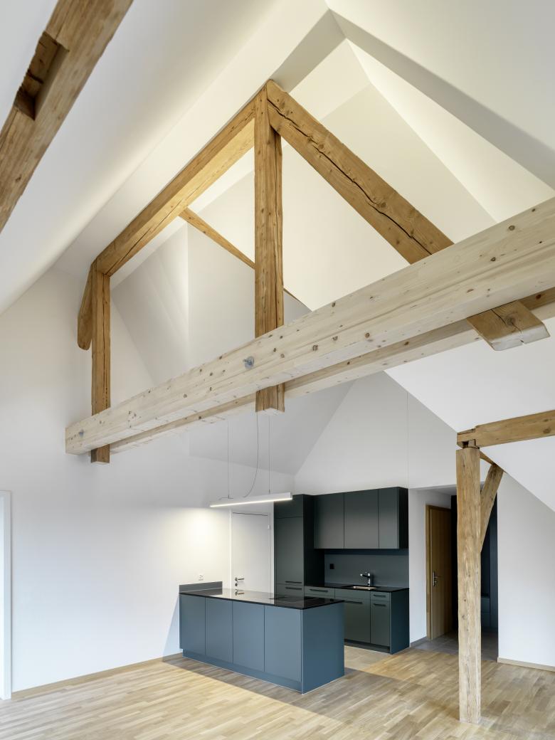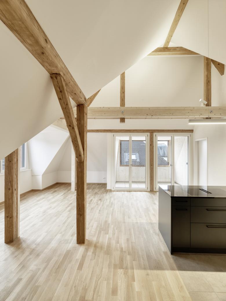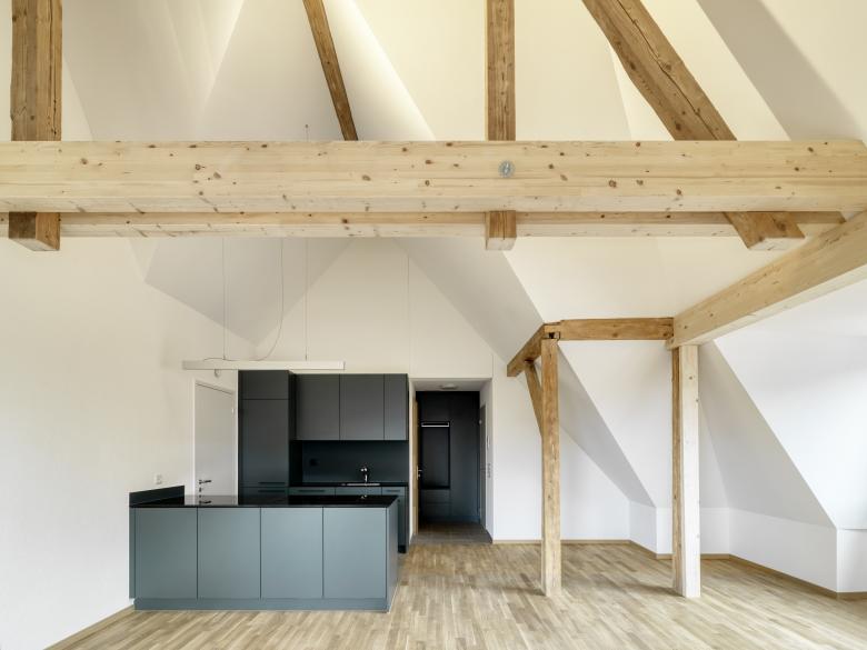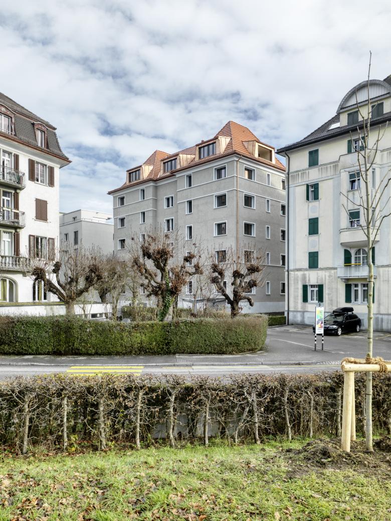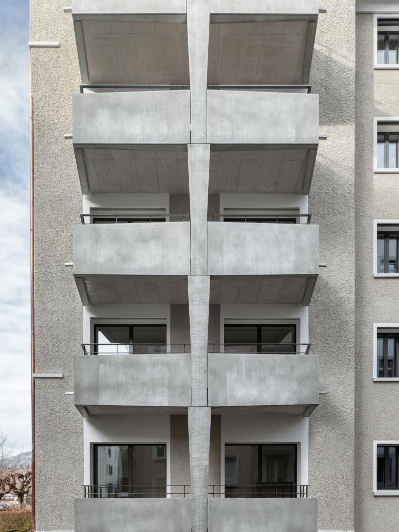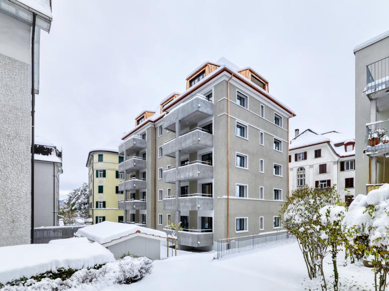 Umbau eines 6-geschossigen Mehrfamilienhaus. Estrich wird zu Wohnungen ausgebaut. Sämtliche Wohnungen erhalten Balkone oder Loggien. Ertüchtigung Brandschutz, Erdbeben, SIA 500 und Energie. Insgesamt sind nun 12 Wohnungen