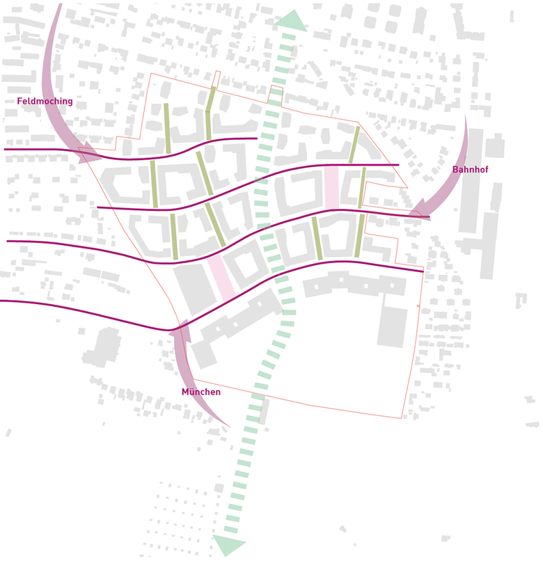 Kern unseres Vorschlags ist das Ziel, das neue Quartier in den Kontext von Feldmoching einzubinden und die geforderte Dichte mit möglichst niedrigen Gebäuden zu erreichen.