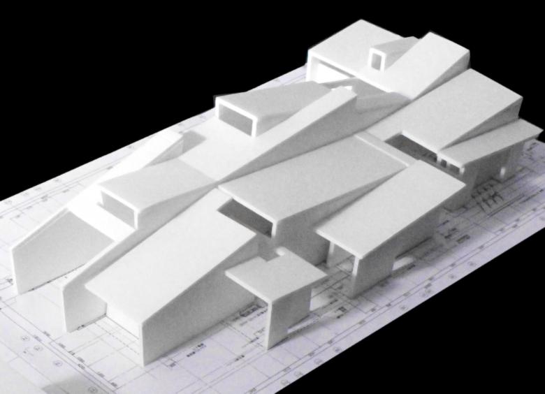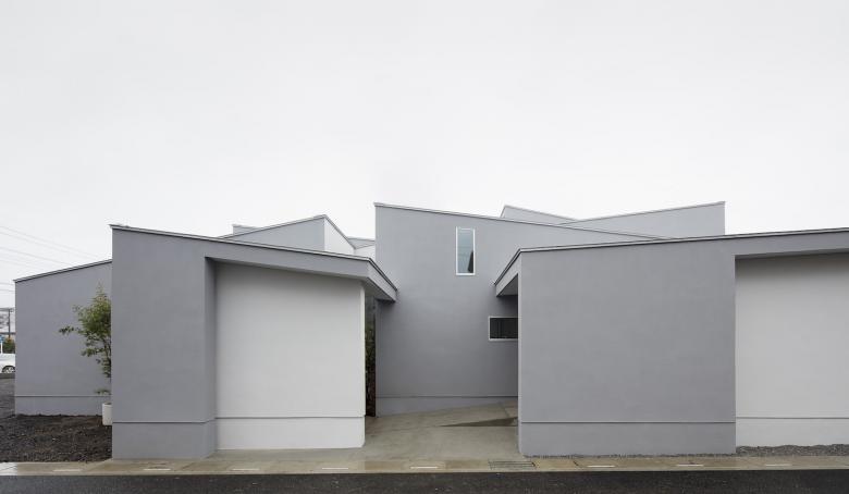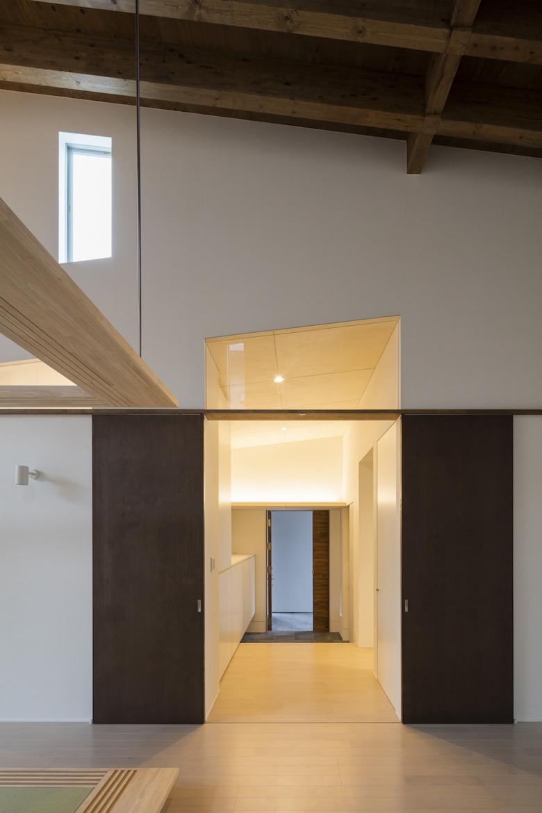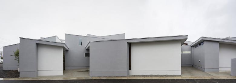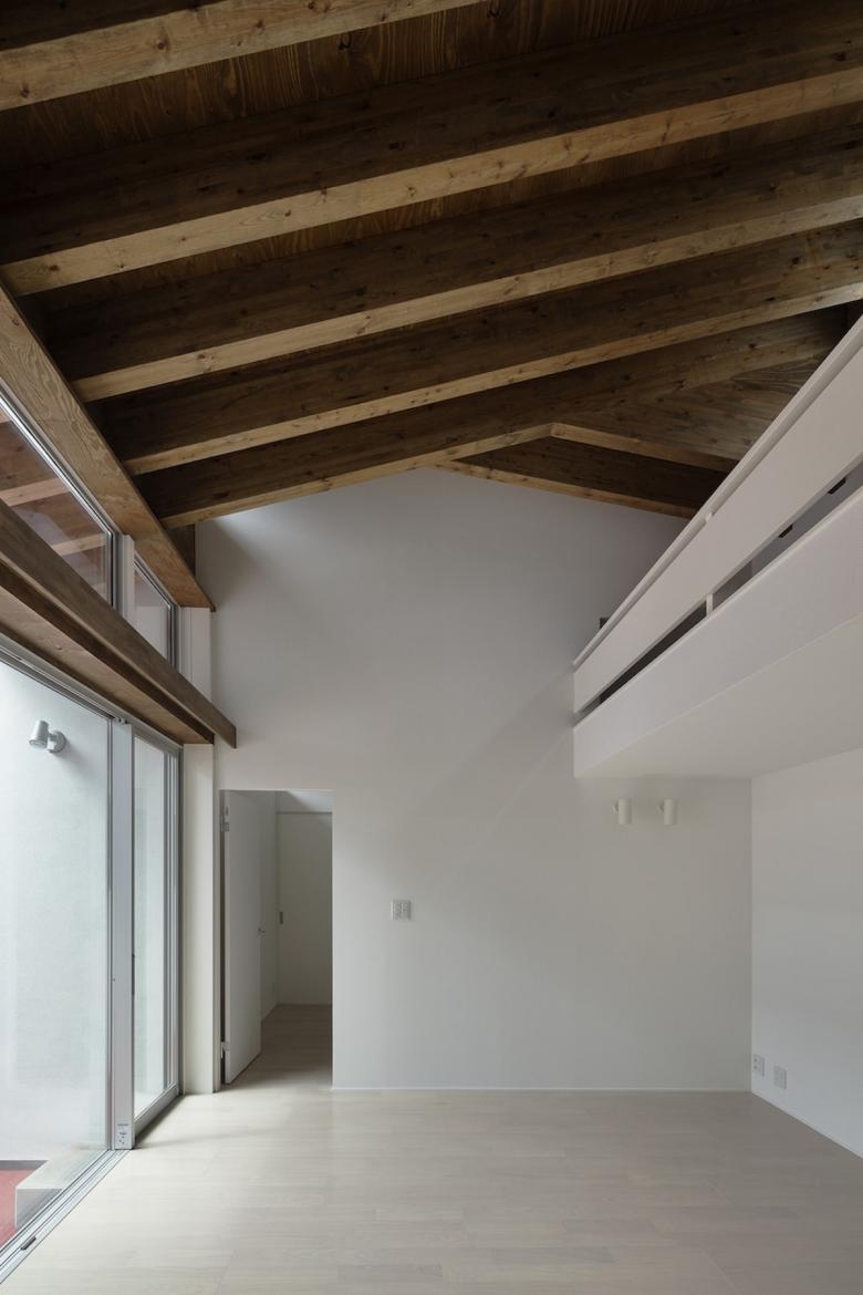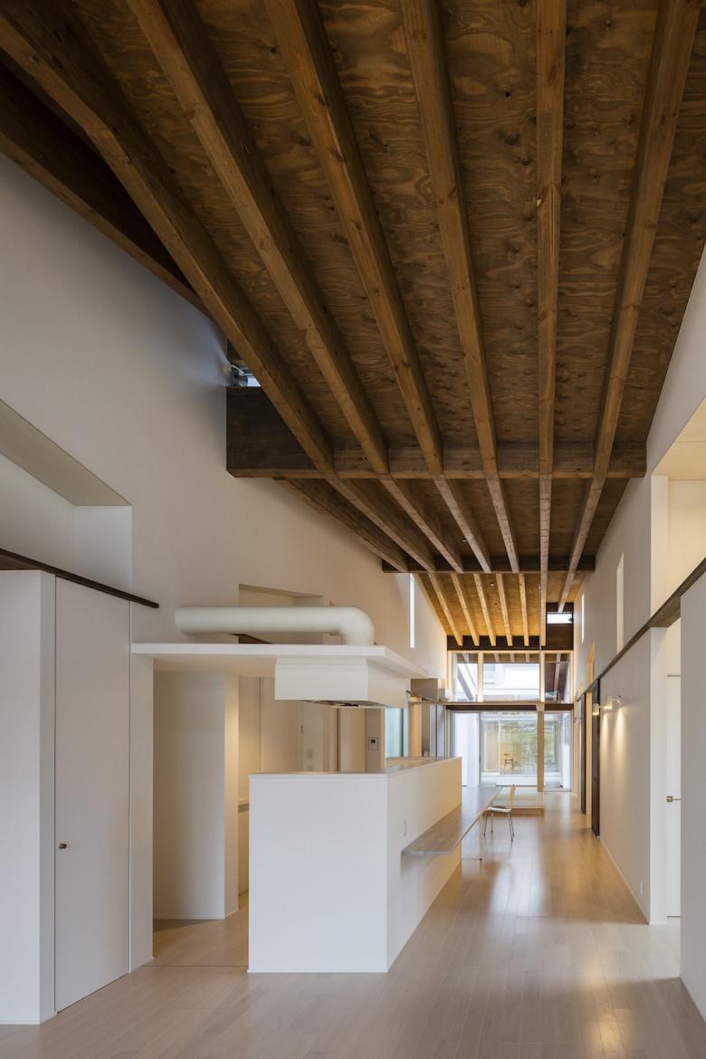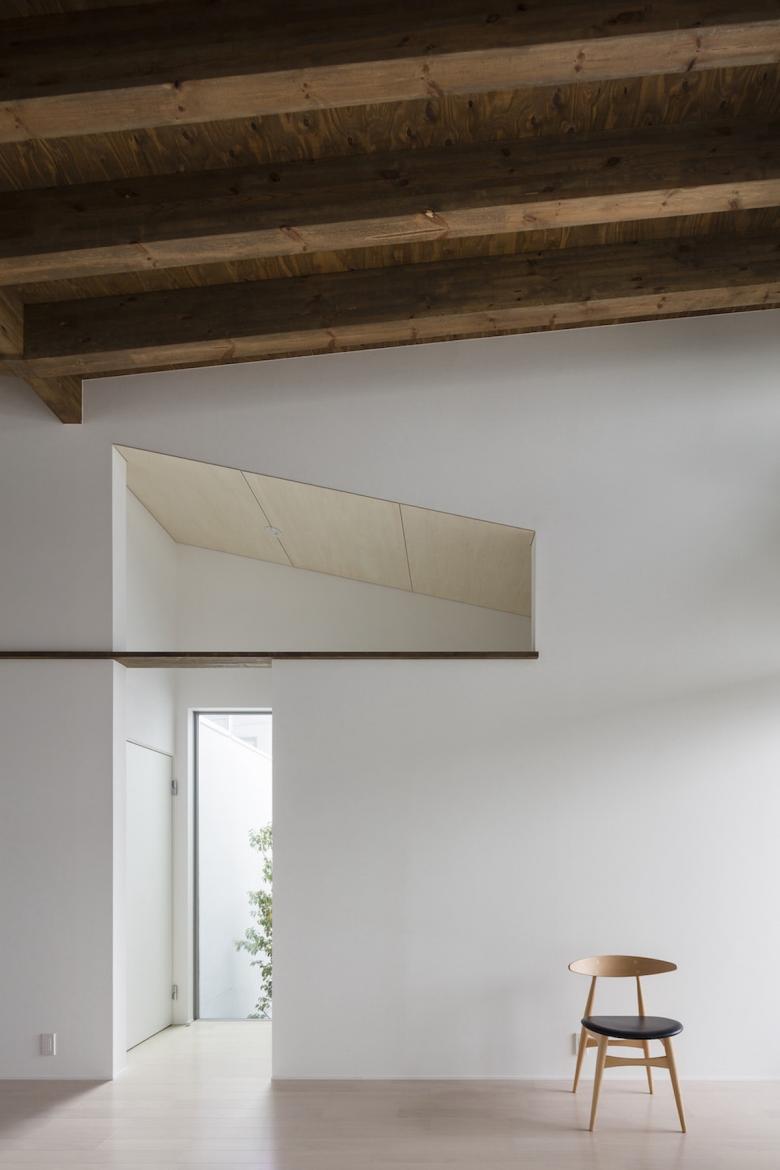 The 30-meter-long main living space and the suites of private rooms on either side are covered with penthouse roofs that overlap repeatedly, as though belonging to a cluster of several houses. Although the building is a single residence, from the street it forms a space much like a row of houses.