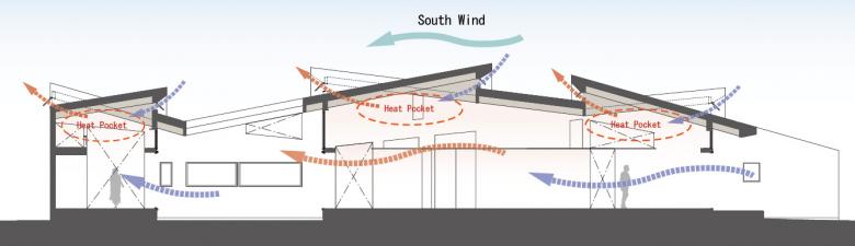The long, expansive roofs are equipped with several high sidelights that bring in sunlight as well as work to improve ventilation. With a design that enables ventilation regardless of pressure or wind direction, the breeze is able to pass through effectively and freely according to the temperature and wind direction for a given day or season, enabling the ventilation of the house to be accomplished.