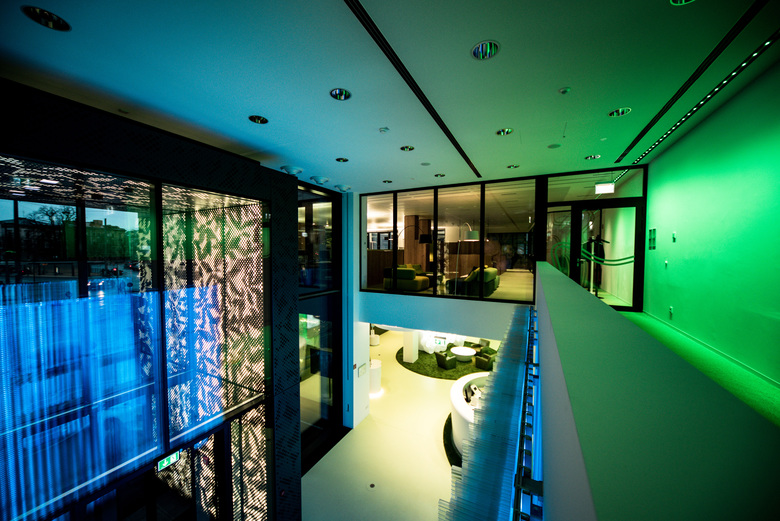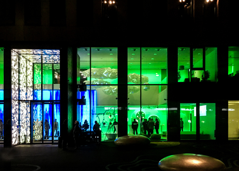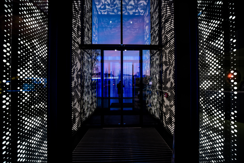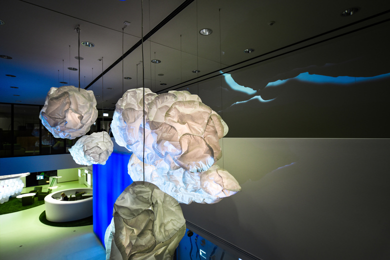 Neugestaltung der ehemaligen Empfangshalle der LEW Zentrale zum Kundenzentrum mit Energiewelt und Espressobar. Eine Textur mit blauen Wellenlinien und überdimensionalen Flusskieseln auf dem Vorplatz des Gebäudes symbolisieren den Lech als Energielieferanten des Konzerns. Ein Monumentalportal aus gelaserten Blechen führt auf einen virtuellen Wasserfall aus illuminierten Doppelstegplatten.