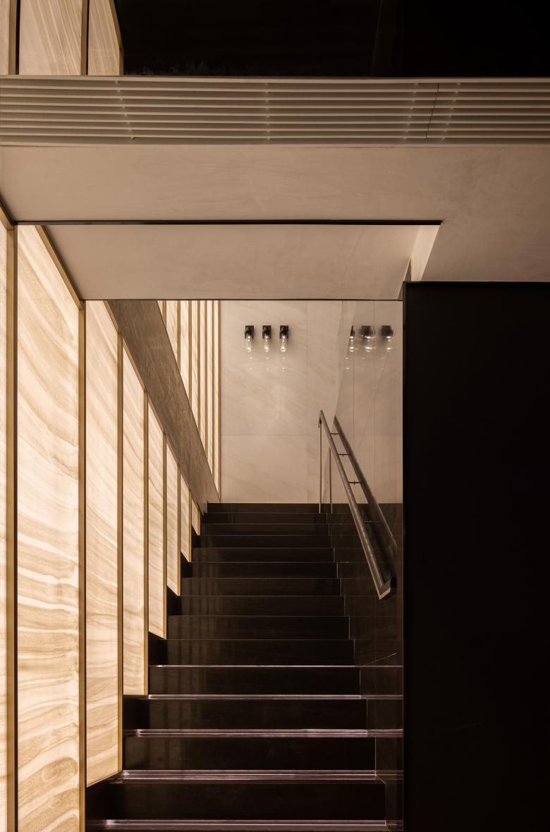 Custom acrylic art panels, accented with brass strips, blend seamlessly with the extending black staircase to create a compelling architectural narrative, transforming an otherwise monotonous stairwell into a dynamic and engaging feature.