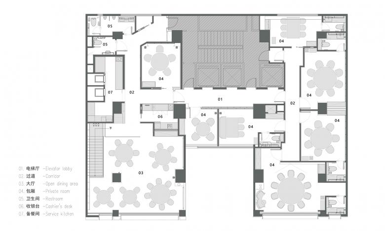 A direct elevator from the parking lot leads to the second-floor private rooms, enhancing convenience and privacy while elevating the overall dining experience. The hotpot induction cookers, disruptive to interior aesthetics, are seamlessly integrated into the tables, significantly enhancing the space’s visual appeal.