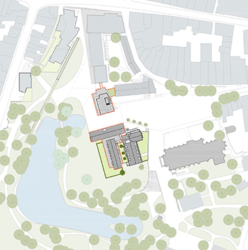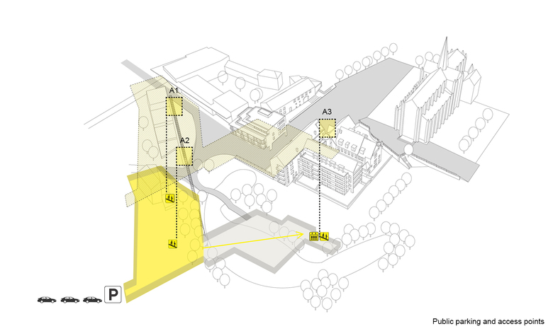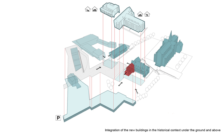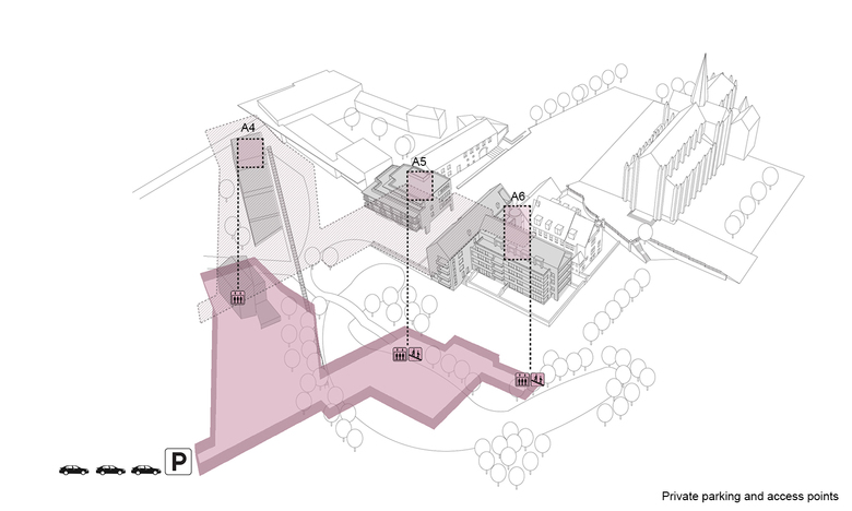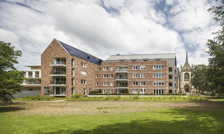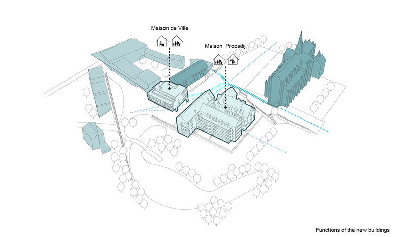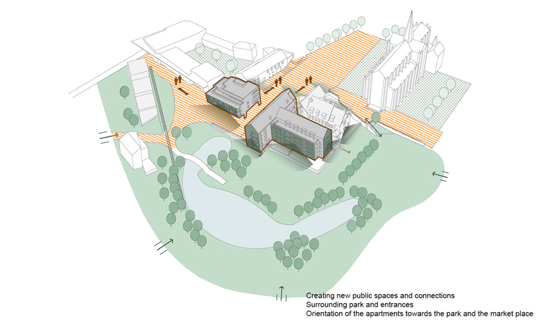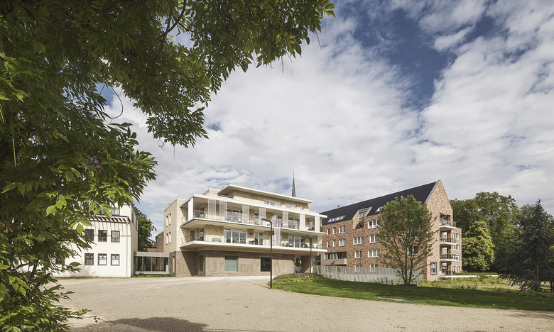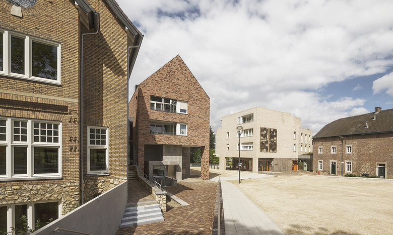 Maison Proosdij consists of three building volumes, which are connected to one another via a central hall. The entrance to the complex is located on the side of the enlarged market square, where also the public access to the underground parking is located at a prominent porch. The contours of the new building elements are oriented with respect to shape, profile and volume of the monastery, but speak in terms of architecture and materiality of each block a distinctive, own language. In the existing, partially demolished monastry two multi-storey townhouses are realized, one of which in the former chapel. The facades of the monastery are restored and only where necessary, adapted to the requirements of the new use. In the new wing 19 apartments are implemented on four levels, which are either geared to the park or to the market square. The entire complex keeps the memory of the old, in the cityscape of Meerssen charakteristik  monastery alive, but at the same time due to the additions the ensemble creates a new significant character for the place between the monumental basilica and the beautiful park with historic trees. The expanded marketplace, framed by the construction of the Maison de Ville and the Maison Prosdij will make an important contribution to the new perception of the public space in the heart of Meerssen.