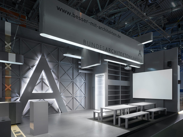Die Elemente des Messestandes der Bundesarchitektenkammer stammen mehrheitlich aus dem „Wegwerf-Lager“ eines Messebauers mit ausgemusterten Resten unterschiedlicher Messestände. Denn jedes wieder verwertete Teil bedeutet weniger Energie- und Ressourcenverbrauch – und in diesem Falle auch minimierte Transportwege durch die zentrale Lagerung und Montage. Die einzelnen Bau-Elemente wurden entsprechend der Stand-Abmessungen und der vorgegebenen Funktionszonen in einer Art 3D-Puzzle kombiniert und mit ökologisch korrekten Farben homogenisiert. Der collagenartige Charakter des Messestandes sollte sichtbar bleiben, um den Recycling-Gedanken deutlich wahrnehmbar zu präsentieren. Die Lichtplanung des Lichtlabors Bartenbach wurde mit geliehenen, teils gebrauchten und Energie-effizienten Halogen-Leuchten umgesetzt – Lichtintensität und Lichtfarbe entsprechen den unterschiedlichen Anforderungen der Nutzungsbereiche.