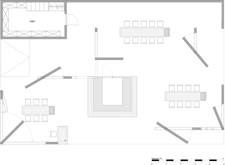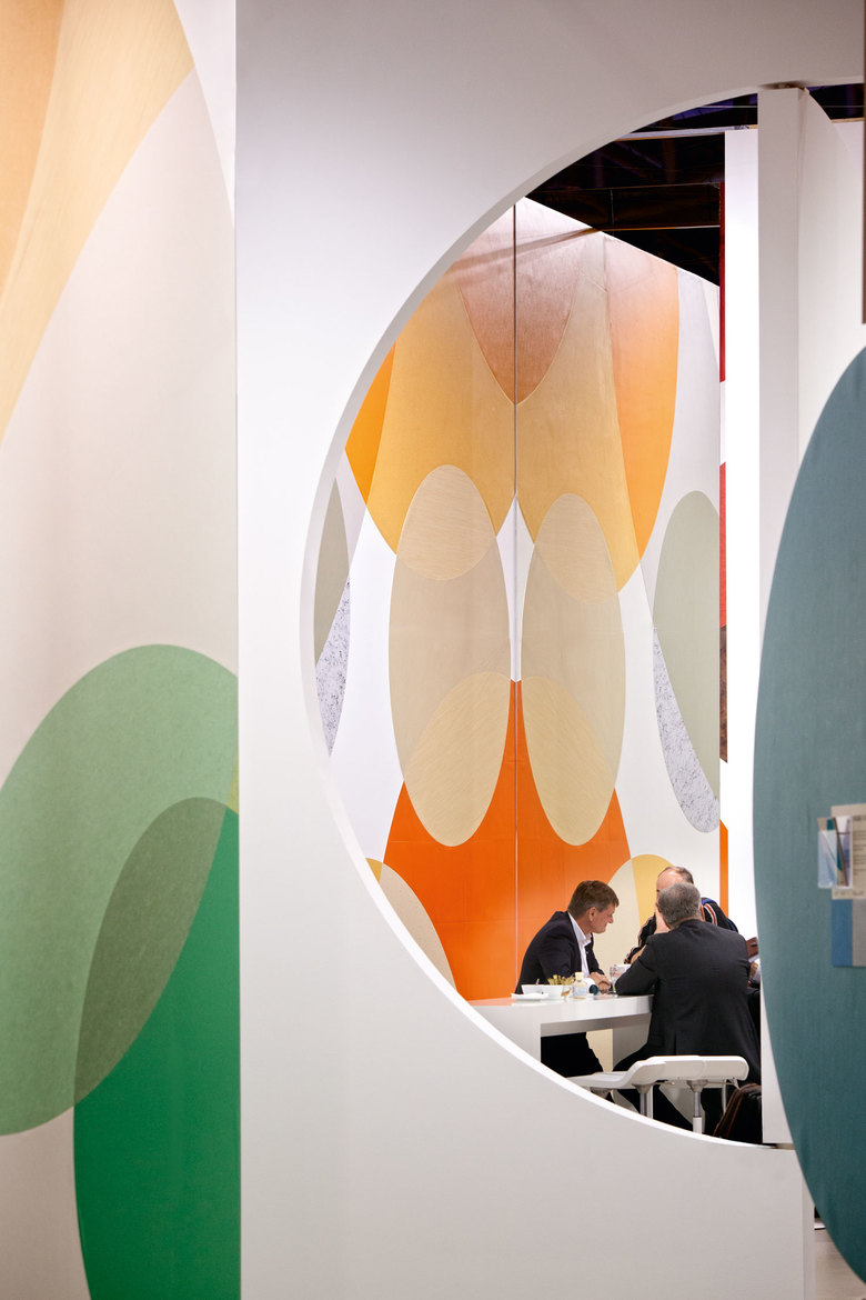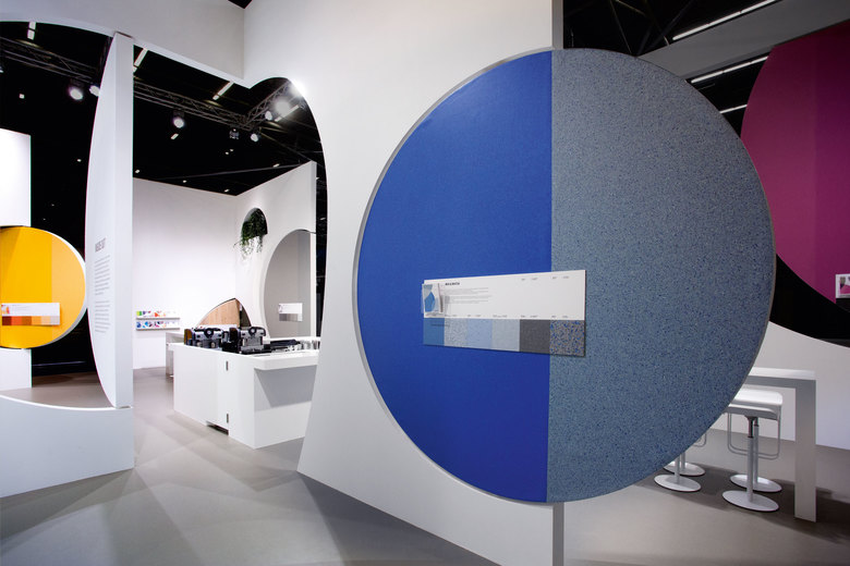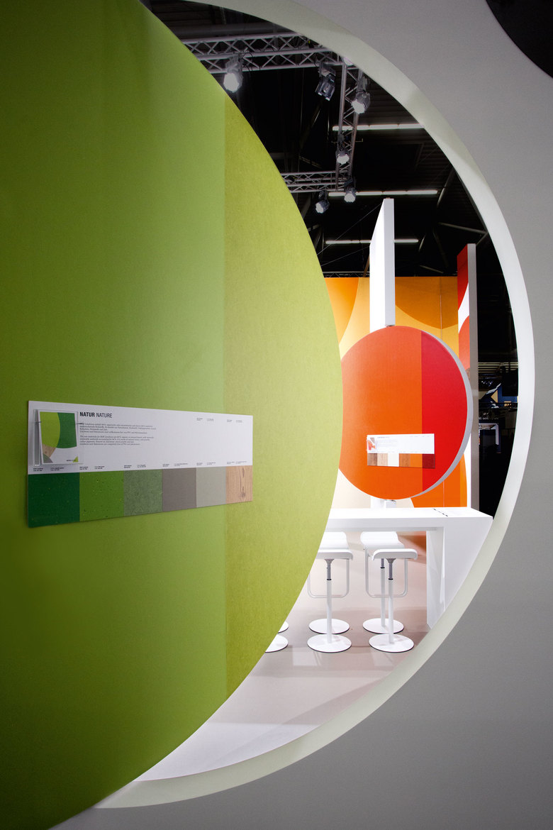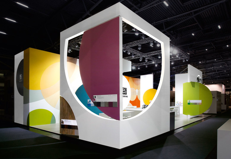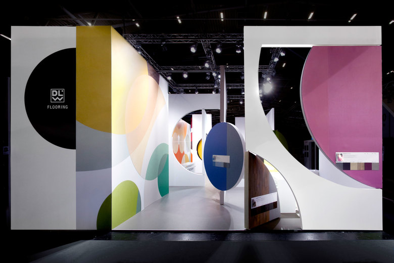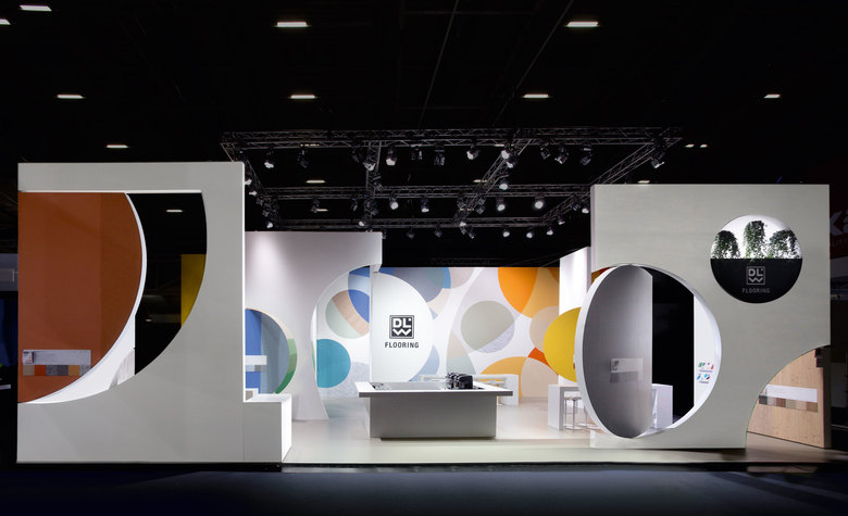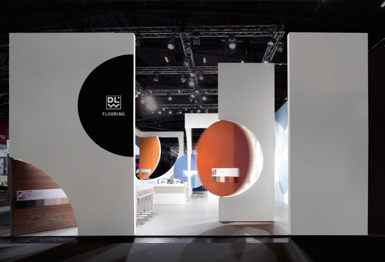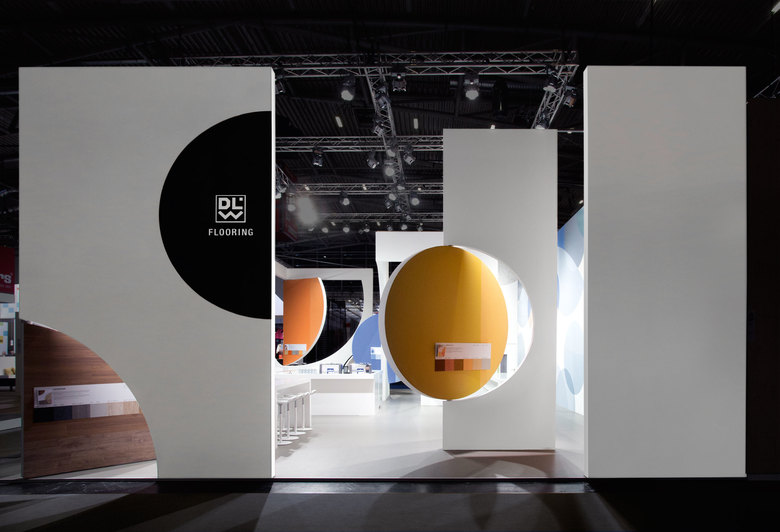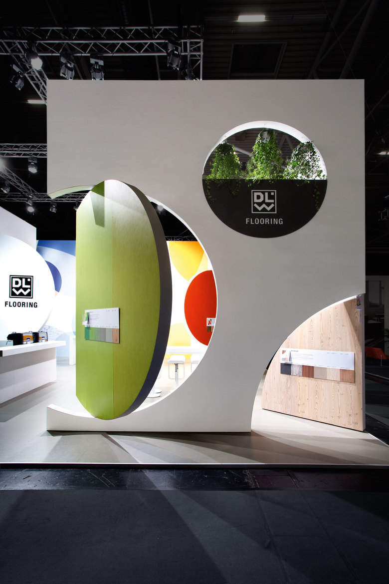 Ganz nach dem Motto „Inside out“ strahlt das Innere des Standes nach außen. Die weißen Außenwände skizzieren nur grob den Rahmen des Stands. Aus den Wänden sind großflächig Kreise und Kreissegmente ausgeschnitten. Diese sind beidseitig mit Collagen aus DLW-Produkten belegt und als drehbare Scheiben wieder in die Wände eingesetzt. Über diese Elemente können die Besucher mit dem Stand interagieren und sie kommen so spielerisch mit der Produktwelt in Kontakt. Gleichzeitig entstehen so von außen immer neue Perspektiven auf den sich ebenfalls verändernden Innenbereich. Für diesen Reigen der Formen und Farben bilden großflächige Materialkompositionen an den Rückwänden eine Art permanentes Bühnenbild. Auch die obligatorischen Besprechungsinseln sollen in dieser Inszenierung nur Statisten sein und ordnen sich visuell unter.