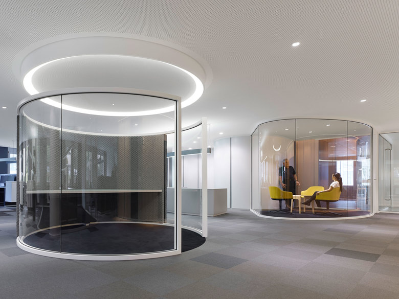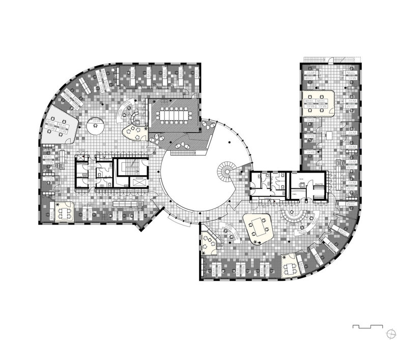 Angesichts der hohen Auswärtspräsenz der meisten Mitarbeiter galt es, das Prinzip der festen Arbeitsplatzzuteilung aufzubrechen und ein non-territoriales Arbeitsplatzsystem zu etablieren. Höhenverstellbare Arbeitsplätze erlauben die Adaption des Arbeitsplatzes an den jeweiligen Nutzer. Gleichzeitig wird das Arbeitsplatzangebot optimal ausgelastet. Eine Mischung von separierten Einzelbüros und Teamarbeitsplätzen sowie offenen Multizonen und intimen Rückzugsarbeitsinseln garantiert die variable Nutzung der Flächen. Den unterschiedlichen Bedürfnissen für Gesprächssituationen wird durch ein differenziertes Angebot an kommunikativen Zonen begegnet. Herkömmliches „Abteilungsdenken“ ist hiermit überholt. Die Mitarbeiter arbeiten dezentral und bilden nach Erfordernis bereichsübergreifende Kompetenzteams. Kommunikationswege werden so effizient verkürzt.