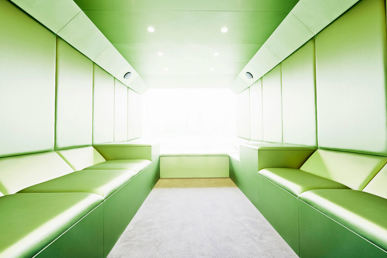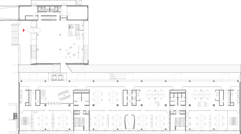 Dynamik und Bewegung kennzeichnen die Gestaltungselemente, die Angestellte und Besucher schon beim Eintritt in die großzügige Empfangshalle aufnehmen. Diese Elemente führen durch die offenen Arbeitszonen und die eigens eingerichtete Mitarbeiterbibliothek bis in den hauseigenen Fitnessbereich im 5. Obergeschoß mit faszinierendem Blick über Frankfurt. Polygonale Raumelemente und eine breit aufgefächerte Materialwelt stehen für den hohen gestalterischen Anspruch des Unternehmens selbst. Offene und transparente Arbeitsbereiche, gepaart mit halböffentlichen und diskreten Besprechungszonen fördern eine kreative und kommunikative Arbeitsatmosphäre.