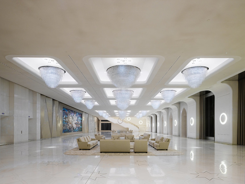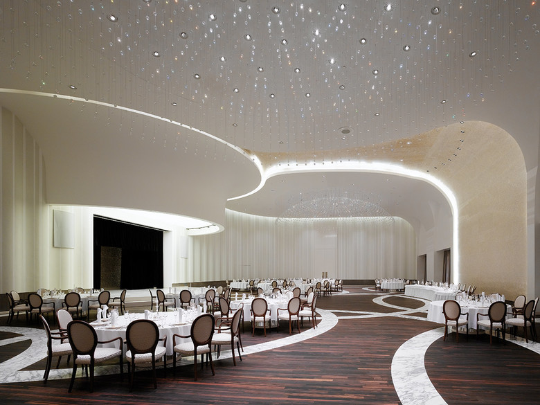 Ausgerichtet an der Mittelachse, sind im Bankettsaal Bühne und Präsidentenplatz visuell verbunden. Ein weiteres zusammenführendes Element ist die kostbare, dramatisch in die Decke ragende Perlmutt-Wand. Links und rechts der Bühne streben mit Swarovski-Tapeten verkleidete Wände in optischer Wellenbewegung dem Präsidialplatz entgegen. Die ondulierende Wandstruktur erscheint als fortgesetzter Bühnenvorhang und erwirkt durch Reflektionseffekte zusätzliche Tiefen. Zwei abgehängte, elf Meter messende Swarovski-Lichtkuppeln überkrönen den Saal, ihre sphärisch aufgelösten Kristalle füllen ihn mit Weichheit. Gegengewicht schafft massiver Parkettboden aus Makassar-Ebenholz. Raffiniert im Ornamentalcharakter eingelegte 0,5 Meter breite Streifen aus Arabescato-Corchia-Marmor gliedern und weiten den Raum. In vielen Baudetails stehen ausladende Formen und feine Oberflächentexturen einander gegenüber, erzeugen aber immer Harmonie.
