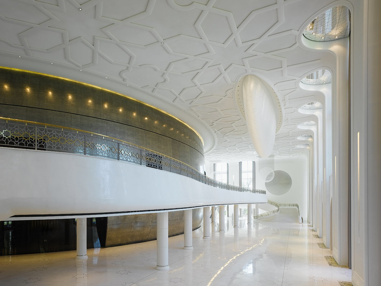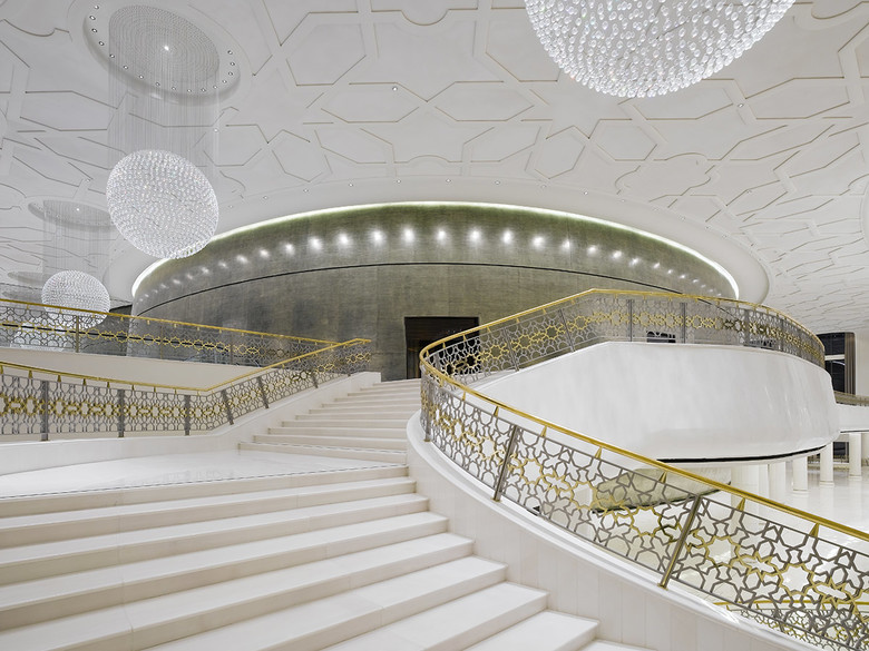 Klassisch in seiner Außenwirkung, bereitet das Gebäude durch die Fensterfront auf Modernität im Inneren vor. Hinter illuminierten Fassadensäulen aus Thassos-Marmor beherrscht – ähnlich gewichtig – das epochale Halbrund eines Swarovski-Lüsters das Hauptfoyer. Gigantisch und kontrastierend leiten die zwei Bauelemente Säule und Lüster, Verbindungen unterschiedlicher Architektur-Traditionen, Synthesen westlicher und östlicher Kultur ein. Drei Marmorportale mit geschnitzten Holztüren führen in das Vestibül. Bewusst und atmosphärisch dicht wird die Großzügigkeit des Hauptfoyers über 16 Meter Raumhöhe und eine Grundfläche von 2.500 Quadratmetern inszeniert. Der spektakuläre Lüster skizziert mit neun Metern Höhe und 23 Metern Länge die Längsachse des Foyers. Gefertigt wurde das Unikat aus 1,1 Millionen Swarovski-Kristallen. Die Gebäudefront abbildend, zeichnet eine Empore die Längsachse. Seitlich mündet sie, mit zum Foyer hin offener, umarmender Geste, in diametral liegenden Freitreppen. In dem offenen Grundriss unterstützen sie die innere Gliederung. Teils als subtile Raumstruktur, teils als Designobjekte entlasten die „schwebenden“ Treppen die monumentale Palastkulisse. Moderner Materialwertigkeit folgend, sind sie und ihre Brüstungen mit Stucco Veneziano, einem glatt polierten, warmweißen Stuck mit Zusätzen von Marmorstaub, beschichtet. Ornamente als stilgebende Elemente der Landeskultur werden im gesamten Gebäude in vielfältigen Möglichkeiten und Materialitäten eingesetzt. In Messing und Edelstahl findet man sie im Geländer der Empore. Die ornamentierten Foyerböden aus hellem Sivec-Marmor werden durch traditionelle Motive aus Edelstahl rhythmisiert. Ein umlaufender Wandfries aus Irish-Green-Marmor fasst die Böden in klassischer Manier. Groß skaliert, wiederholen sich die geometrischen Bodenbewegungen an der Decke und optimieren, als dreidimensionale Dekorleiste an Gantsch-Schnitzerei erinnernd, die Raumakustik. Entscheidend für die räumliche Wahrnehmung sind die 16 Meter hohen Fensterachsen des Foyers. Von der Bodenebene in die Höhe strebend, zur Decke hin gerundet, komprimieren sie die lichte Raumhöhe und versinnbildlichen Einheit – architektonisch wie kulturell. Ornamentierte Spiegel oberhalb der Fenster dramatisieren die vertikale Dimension. Deckenhohe, silberfarbene Vorhänge setzten in dieser Weite sanfte Akzente. Sich gegenüberliegende konkave Palladium-Panneaus vervollständigen die Längsausrichtung des Foyers. Sie bündeln und verstärken – ebenso wie die in usbekischer Tradition aufwändig gipsgegossenen Reliefwände – Reflektionen von Kunst- und Tageslicht. Von den Palladium-Schildern ausgehend, krönen acht Kugellüster mit bis zu 3,40 Meter Durchmesser die Seitenflügel der Empore. Ausschließlich 70 Millimeter große Kristalle wurden für die Lichtobjekte aus jeweils 2.880 Swarovski-Steinen verarbeitet. Über den Klammern der Treppen verdoppeln Spiegelebenen mit Flächenornamenten visuell die Foyerlänge und Lichtfluchten der Rundlüster. Identitätsstiftendes Element und größter Raum des Bauwerks ist, mit 1.850 Sitzplätzen, das Auditorium. Mit dem „Haus im Haus“ findet die großzügige Palastarchitektur – weicher und organisch – im Innenraum eine Entsprechung. Plastisch auswölbend behauptet sich der Saalkörper im Außenraum von Hauptfoyer und Empore. Seine Haut – weltgrößte Liquid-Metal-Fläche – misst 2.000 Quadratmeter. Beinahe sinnlich dehnt sich die Zink-Messing-Legierung mit in 16 Schleifgängen erzielter lebendiger Patina unter der Spannung des verborgenen Inneren aus.