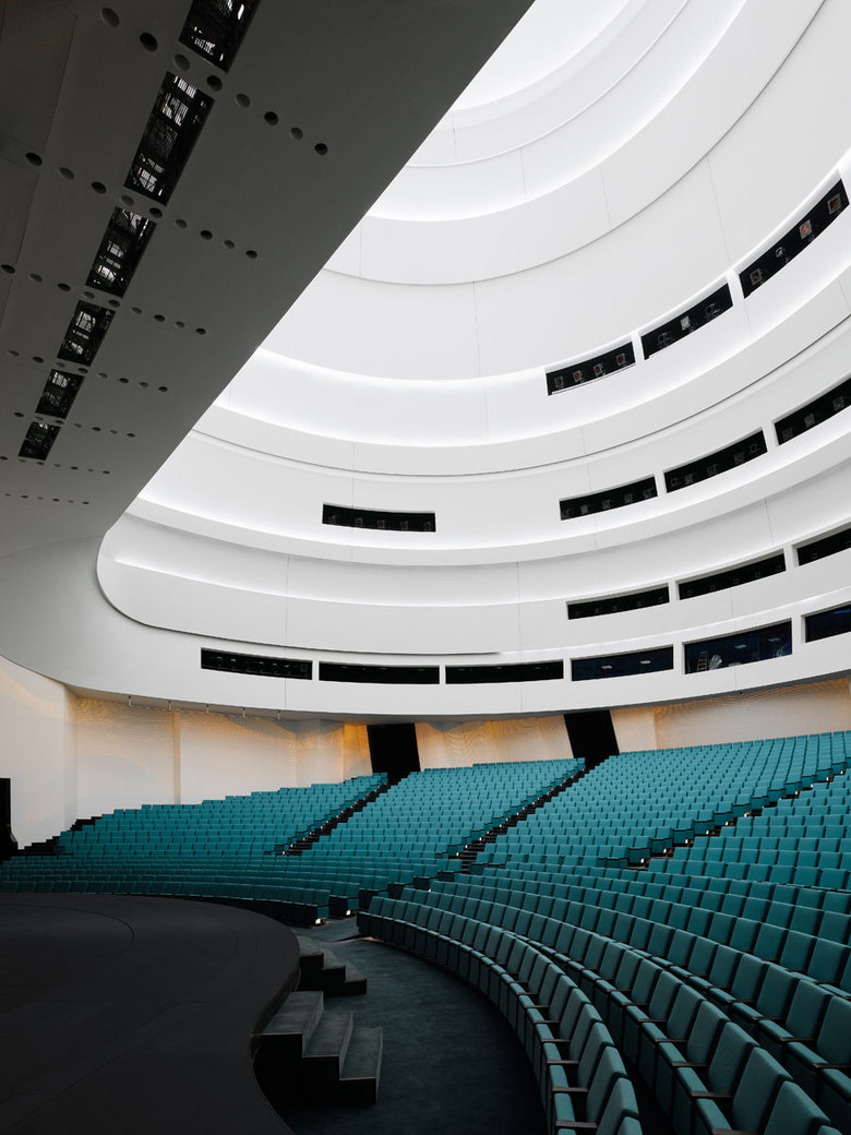 Sechs Portale aus hochglänzend poliertem Ebenholz ermöglichen durch eine Metallhaut den Zugang ins Auditorium. Horizontal in zwei Teile gegliedert, ist der gigantische Saal in seiner klassischen Auffächerung als Amphitheater ein Ort der Inspiration. Mit 48 Metern Höhe und 50 Metern Raumdurchmesser umschließt dieser ein imposantes Volumen. Über der rückwärtig auf unterschiedliche Tiefen gefrästen Corian-Wand im unteren Teil öffnet sich der Saal in eine achsensymmetrische Kuppel. Für die überwölbende Konstruktion der Lichtkuppel wurden 600 Tonnen Stahl verbaut. Das Gewölbe, historisch ein wichtiges Detail usbekischer Baukultur, integriert hinter der neuen Ästhetik auch Funktionalität. Übereinander angeordnete und zueinander versetzt umlaufende Bänder fassen Bühne und Zuhörerraum zu einer Einheit zusammen. Mehrschichtig und hinterleuchtet sorgen die Kuppelbänder zum einen, da vollkommen absorbierend, für gute Raumakustik, zum anderen für erhabene Lichtstimmungen. Bei Bedarf verwandeln die im Versatz der Ringe verlaufenden Leuchtstoff- und LED-Bänder dank präziser Lichttechnik den Raum in einen schwerelosen Lichtkorpus. Türkisblaue Bezugsstoffe und handgetuftete Teppiche referieren auf Nationalfarbe und Landesidentität.