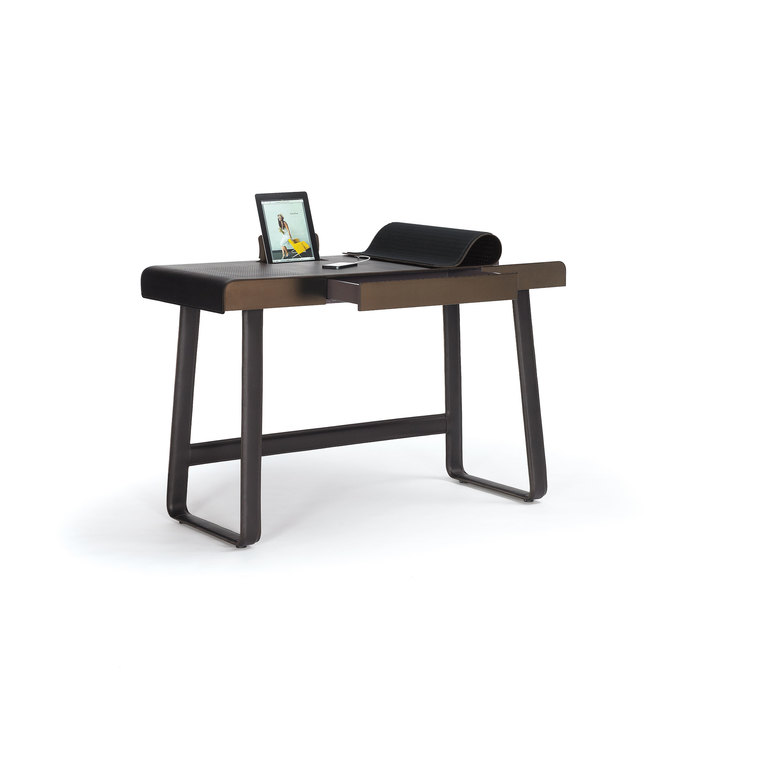 Sekretär. Gestell aus verchromten Flachstahl, optional mit Kernleder ummantelt und Kontrastnaht. Korpus mit Schublade und 4 Ablagefächern/-bereichen aus HPL/Multiplex farbig matt lackiert. Front und Rückseite verblendet mit Edelstahlblech brüniert oder echtholzfurniert in Nussbaum. Schreibfläche seitlich hochklappbar aus Kernleder mit Kontrastnaht. Kabeldurchlass. Gleiter aus Metall, höhenverstellbar.