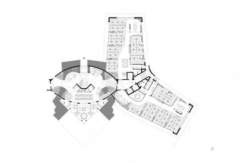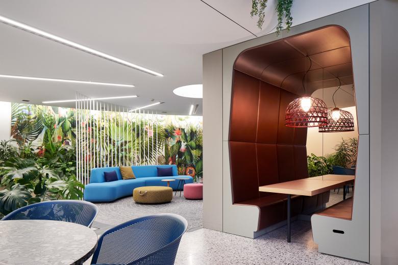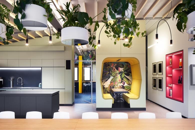 Reizvoll für die Identity Architects war bei dem Projekt, eine Immobilie komplett zu verwandeln, ohne in den Bestand einzugreifen. Eine grundsätzlich andere Atmosphäre wurde über die Umkleidung der Decken erreicht. Bleiben durften die Paneele, allerdings ergänzt durch Farbstreifen. Statt grauer Metalldecken erzeugen so nun Farbverläufe eine neue Raumtiefe, aber auch eine deutlich bessere psychische Balance. Denn Blau beruhigt – und fördert gleichzeitig die Kreativität. Der Verlauf ins Weiß schenkt dem Raum zusätzliche Offenheit und Leichtigkeit. Arbeitswege sind neutral gehalten, um die Konzentration zu fördern. Die Laufwege in rosa sind genuine Stimmungsauffrischer und steigern nebenher die Empathie der Mitarbeiter füreinander. Für noch viel mehr gute Laune sorgen bedacht platzierte Wasserquellen und geschmackvolle Leuchten. Tropikale Tapeten treffen auf weiche Formen und runde Tische. Und bei jeder Zone wurde das Nudge berücksichtigt, dass sich Mitteleuropäer nur bei bis zu 24 Personen als Teil einer Gruppe empfinden. Dennoch wurde insgesamt viel mehr Raum für Kommunikation geschaffen – letzteres war ein ausdrücklicher Wunsch der Mitarbeiter, ist aber gleichzeitig auch eine Anforderung einer sich wandelnden Arbeitskultur, in der sowohl Informationsaustausch als auch Zusammengehörigkeitsgefühle eine immer größere Rolle spielen. Herausgekommen ist dabei eine Eingangshalle, die so manche Hotellobby in den Schatten stellt. Und das neue Café im Obergeschoss bietet eine Atmosphäre, in der man gleichermaßen auftanken als auch neue Ideen ausbrüten kann.