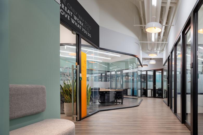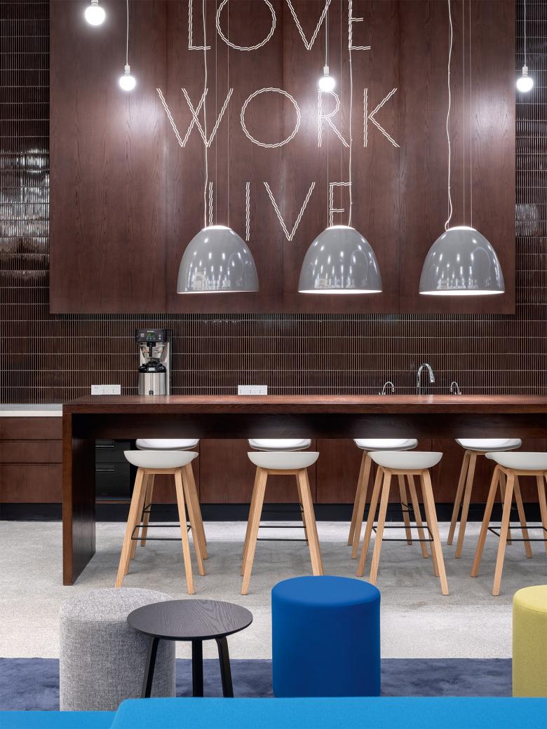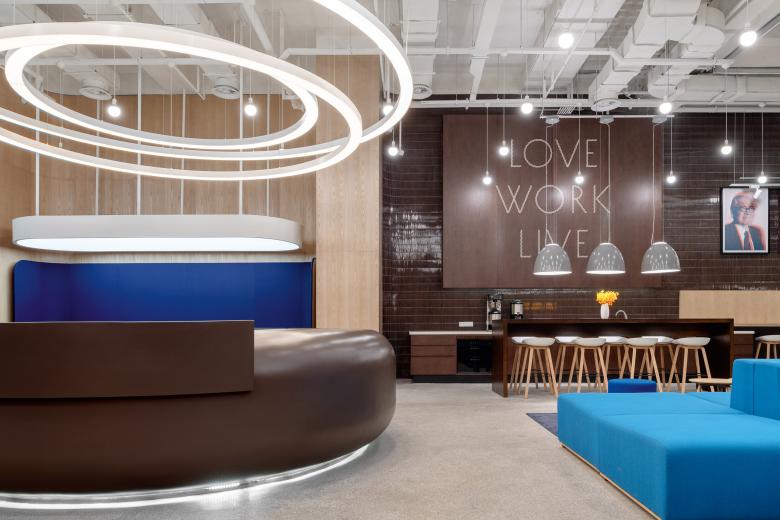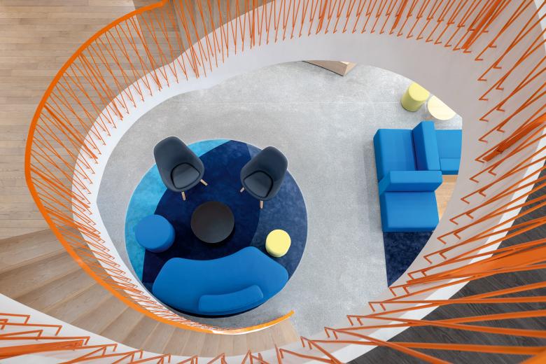 Auf jedem der fünf Stockwerke empfangen zentrale Willkommensbereiche die Nutzer. Um den Empfang gruppieren sich dabei vielfältige Kommunikationsangebote – kleine und große Besprechungsräume, Cafeteria sowie diverse Rückzugsräume, sprich: kleine Besprecher-Nischen, Alkoven oder akustisch abgeschirmte Telefonräume. Abgeschlossene Private Offices in Stückelungen von zwei bis 30 Arbeitsplätzen bieten ein leicht skalierbares und flexibles Arbeitsumfeld für insgesamt 2.500 Menschen.