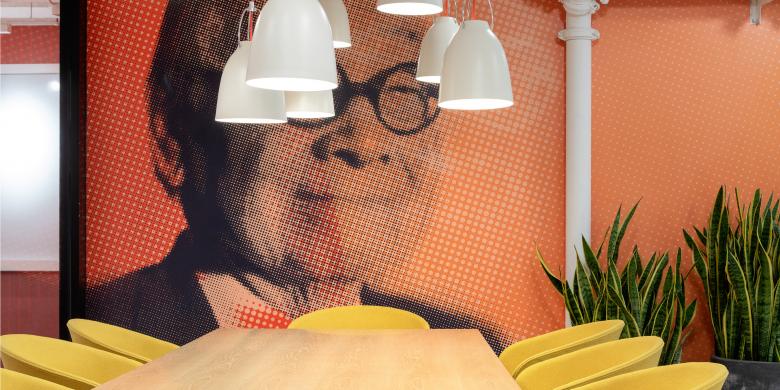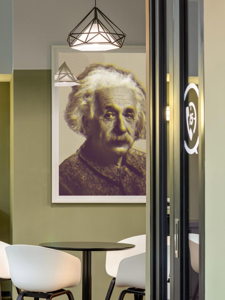 Die Gestaltsprache nimmt die Energie des Coworking auf: Terrazzoböden, offene Decken und Holzoberflächen schaffen in Verbindung mit kräftigen Farben eine anregende, aber verbindliche Atmosphäre für eine Zielgruppe, die immer in Bewegung ist. Um die große Fläche in identifizierbare Orte zu zonieren, haben wir jedes Stockwerk einer Persönlichkeit gewidmet, die in ihrem Arbeitsgebiet den Blick auf die Dinge revolutionär verändert hat: Ieoh Ming Pei, Steve Jobs, Marie Curie, Albert Einstein und Thomas Edison zieren mit ihren Konterfeis die Wände und verleihen „ihren Etagen“ eigenständige Identität. Individuelle Grafik- und Farbkonzepte sorgen dabei für weitere Differenzierung. Die fünf Stockwerke werden so gleichsam zu fünf Sehnsuchtsorten für eigene berufliche Ambitionen.