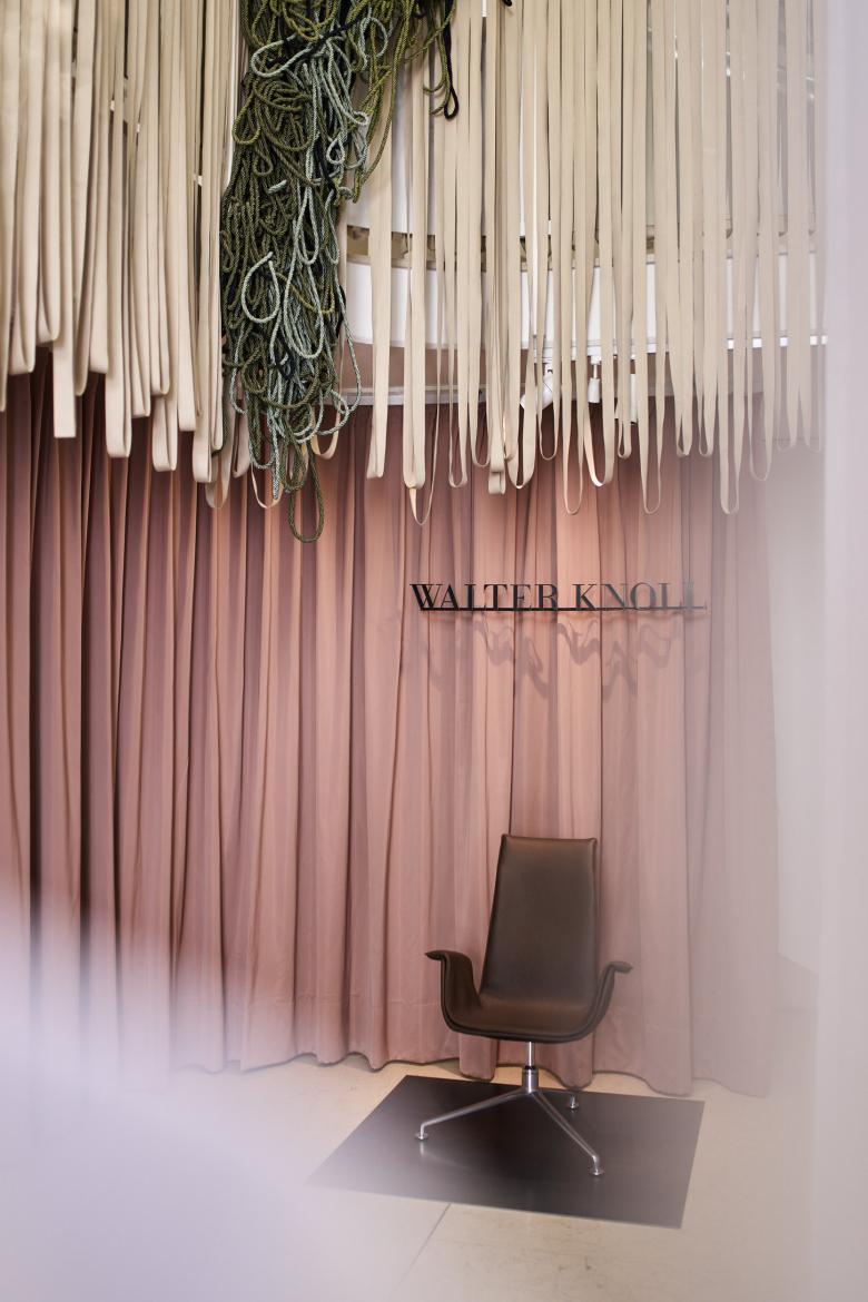 Ob als Bänder in der Polsterung, Nähte in den Bezügen oder Fäden in den Teppichen: Die „Threads of Creation“ ziehen sich durch alle Produkte von Walter Knoll. Aus den Faserstrukturen entwickeln wir ein starkes gestalterisches Mittel, das als visuelles Leitmotiv Innen- und Außenbereich verbindet. Die großformatigen Textilinstallationen sind aus recycelter Baumwolle und biobasierter Viskose hergestellt. Bänder, Fransen und Seile haben wir gemeinsam mit dem Posamenten- hersteller Gustav Gerster entwickelt, einem Traditionsunternehmen der Textilindustrie. Die textilen Elemente sind bewusst temporär installiert, leicht für neue Räume adaptierbar und werden zukünftig in den Showrooms von Walter Knoll wiederverwendet.