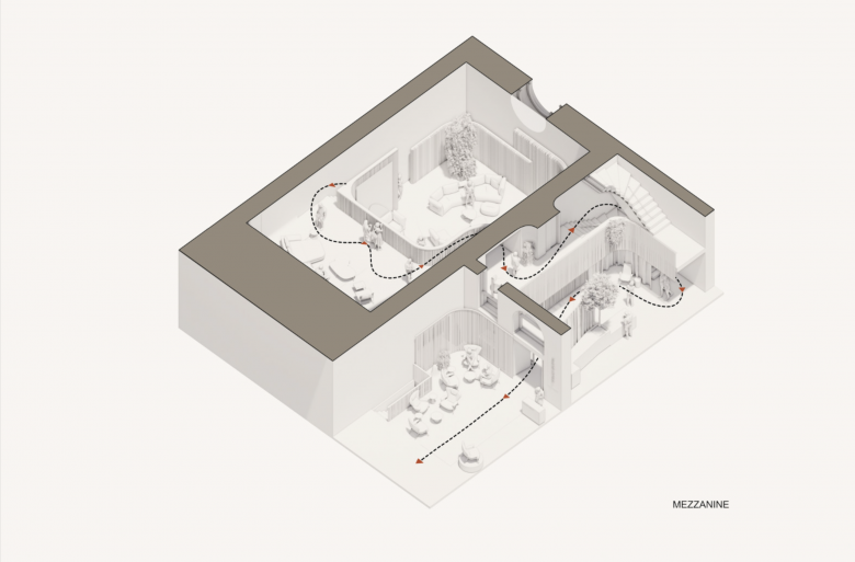 Die Customer Journey führt nun hinauf auf die Empore, wo Landschaft und Molamisa-Modularität aus der Vogelperspektive bestaunt werden können. Das Mezzanin selbst stellt die Teppichkollektionen von Walter Knoll in den Mittelpunkt. Eine kleine Präsentation der „Legends of Carpets“ zeigt ausgewählte Exponate und eine Videoinstallation über das Schaffen von Helmut Scheufele, dessen Kunstwerke die Vorlagen vieler Motive bilden. Von hier geht es zurück zum Counter und für geladene Gäste weiter in den VIP- Bereich im Untergeschoss. In gemütlicher Lounge-Atmosphäre kann hier bei einem Glas Sekt aus der Bar auf neue Geschäftsbeziehungen angestoßen werden.