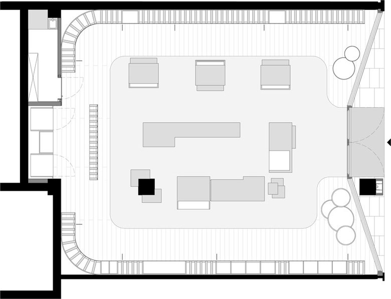 Das Zentrum des Raumes bildet eine Gruppe aus Kassentresen, erhöhtem Degustationstisch sowie einem Verpackungstisch. Zwischen dieser Gruppe und der rechten Längswand stehen drei weitere Präsentationsmöbel; an einer Stütze sind zusätzlich zwei vertikale Regale befestigt. Alle Möbel sind in klaren, kubischen Formen gestaltet. Ihre Geometrie betont das Wechselspiel des Materials zwischen weißem Schichtstoff und geweißter Eiche. Die einzelnen Möbel werden durch ein abgerundetes Rechteck im Boden aus epoxidharzbeschichtetem Estrich gefasst, dass zum Eingang hinausgezogen wird. Außerhalb dieser Zone ist der Boden aus sägerauen Eichendielen.