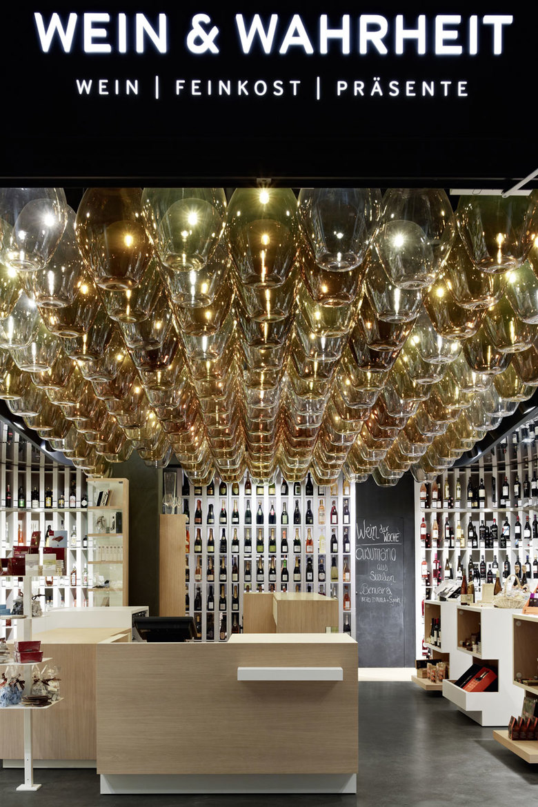 Die etablierte Weinkellerei Höchst hat im neuen Erweiterungsbau des Main-Taunus-Zentrums eine zweite Dependance eröffnet. Für den neuen Laden stand eine Fläche von 80 m² zur Verfügung. Aufgabe war es, auf diesem kompakten Raum ein Sortiment aus mehr als 600 verschiedenen Weinen, Sekten und Spirituosen sowie Feinkost und Geschenkartikel zu präsentieren. Hier werden Auswahl und Beraterkompetenz des Händlers in einem sinnlichen Ambiente herausgestellt, das Shopping-Mall-Flaneure zur Mitnahme animieren soll. Der Blick von außen signalisiert deshalb sofort Weinkompetenz pur. Wie in einer Bibliothek ist der Laden an allen Seiten raumhoch mit Wein gefüllt; durch eine am Rand verlaufende Spiegeldecke multipliziert sich dieser zusätzlich in die Höhe. Über der sich so öffnenden Bühne schweben Glaskörper, die ein starkes key visual des Ladens bilden. In ihnen bricht sich das Licht wie in einem Glas bei Kerzenschein, und sie verleihen so dem modernen Raum eine Weinkelleratmosphäre, die man mit der Lust am Genuss assoziiert.