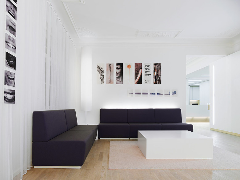An die Behandlungsräume schließt sich der Warteraum im Salon, dem schönsten Raum der Wohnung, an. Weiße Vorhänge filtern hier das Tageslicht, während die Sitzecke in Violett einen effektvollen farblichen Akzent setzt und dem Raum ein loungeartiges Ambiente verleiht. Der Raum kann außerdem für Schulungen genutzt werden. Für Personal-, Gipslabor- und Sterilraum wurde weiterhin das Souterrain erschlossen, in das von der Praxisetage eine Treppe hinab führt.