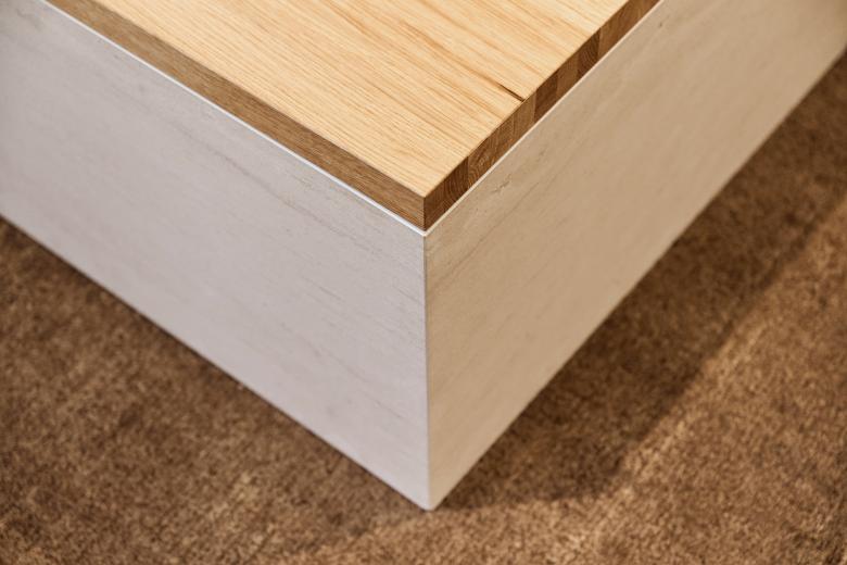 Die hochwertige Materialisierung und sorgfältig gefertigten Einbauten aus Eichenholz sowie der Einsatz heller und naturbelassener Bodenbeläge widerspiegeln den Anspruch der Bank, zwischen sichtbarem Bild und dahinerliegender Wahrheit keinen Bruch entstehen zu lassen. Die mit der Materialisierung erzeugte warme Farbstimmung wird mit einer dunklen Möblierung kontrastiert. Gezielte visuelle Brüche, wie sie beispielsweise durch den Einsatz des Loungeteppiches mit organischem Muster in der Filiale erzeugt werden, akzentuieren das Gesamtbild.