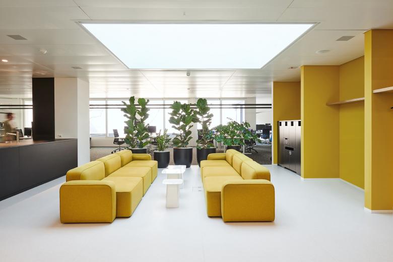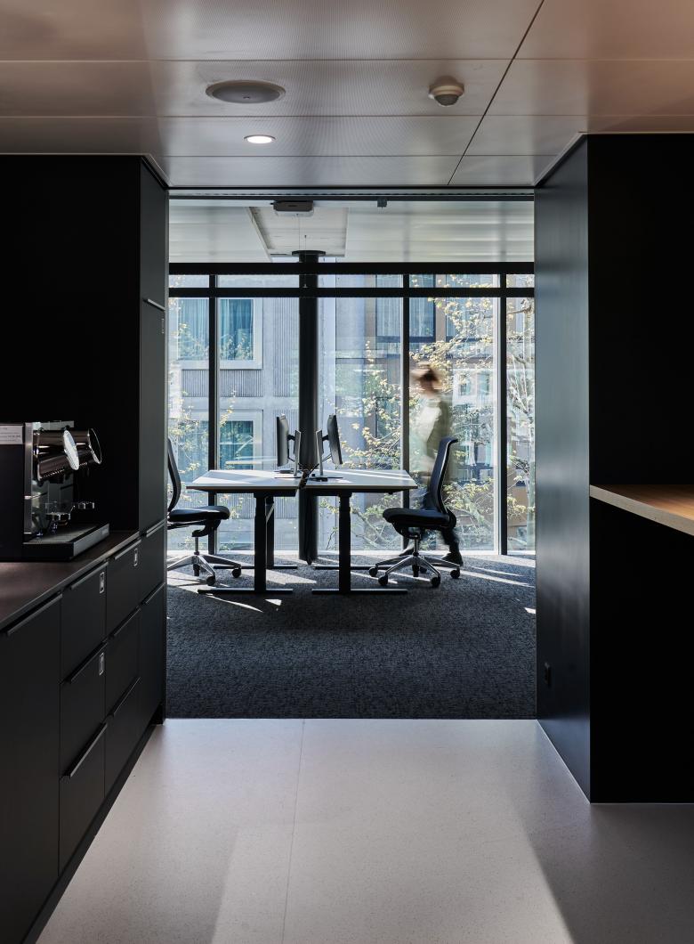 Die sieben Geschosse sind einheitlich als Open Space mit jeweils fensterseitig frei wählbaren Arbeitsplätzen konzipiert. Sie werden mittig durch eine Begegnungszone mit Teeküche, Sitzungszimmer und Besprechungsmöglichkeiten unterteilt, die jeweils beidseitig zugänglich sind. Das durch die grosszügigen Fensterfronten und die verglasten Sitzungszimmer helle Ambiente kombiniert mit starken Schwarz-Weiss-Kombinationen widerspiegeln die Corporate Identity der Basler Kantonalbank. Die Aussenseiten von Teeküche und Sitzungszimmer sind mit Holz und sichtbaren verchromten Leitungen umrahmt und auf jedem Stockwerk wurde eine dominierende zweite Wandfarbe eingesetzt. Die strassenseitig angebrachten Vorhänge unterstützen die Akustik, schützen vor Lichteinfall und tragen zusätzlich zu einem Ambiente bei, in dem sich die Mitarbeitenden aufgehoben fühlen und angeregt werden.