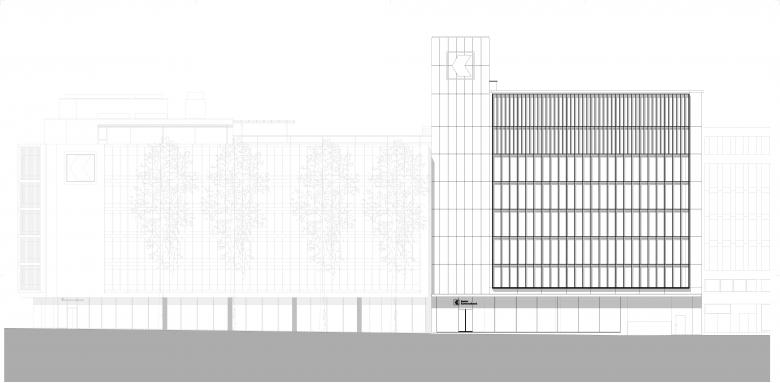 Prägendes Element der neuen Fassade ist die Rasterung, die sich an das vordere Gebäude anlehnt. Die verglasten Lamellen der Aeschenvorstadt werden mit 30 cm langen schwertähnlichen Lamellen von Mint Architecture neu interpretiert. Sie dienen den Innenräumen des Brunngässleins als Sonnen- und Blendenschutz und bestehen aus eloxiertem Aluminium, dessen Wirkung und Anmutung sich je nach Lichteinfall ändert. Durch die Rasterung ist es den Architekten gelungen, die Firmenidentität neu zu interpretieren und die Gebäudehülle aus dem Bestand heraus weiterzuentwickeln.