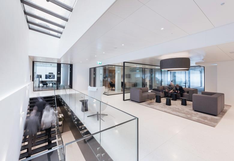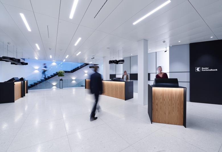 Starke Kontraste – Beim Design setzt Mint Architecture mit kontrastreichen Schwarz-Weiss-Kombinationen, angelehnt an das Corporate Design und das Basler Wappen, starke architektonische Akzente und kombiniert dazu sinnliche Materialien und Formen. So widerspiegelt der grossflächige Kalksteinboden Wertigkeit, während das helle Holz, wie beispielsweise bei den Theken, für ein behagliches, nahbares Ambiente sorgt. Abgerundete Formen bei den Deckenleuchten und beim Mobiliar brechen die hellen, offenen Flächen. Sie schaffen im Lobbybereich und in den Besprechungszimmern ein stimmiges und diskretes Umfeld.