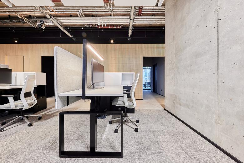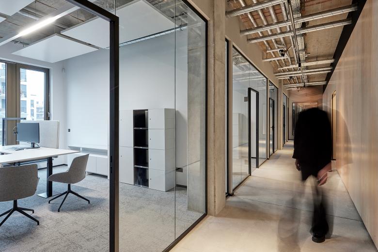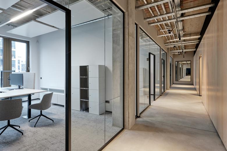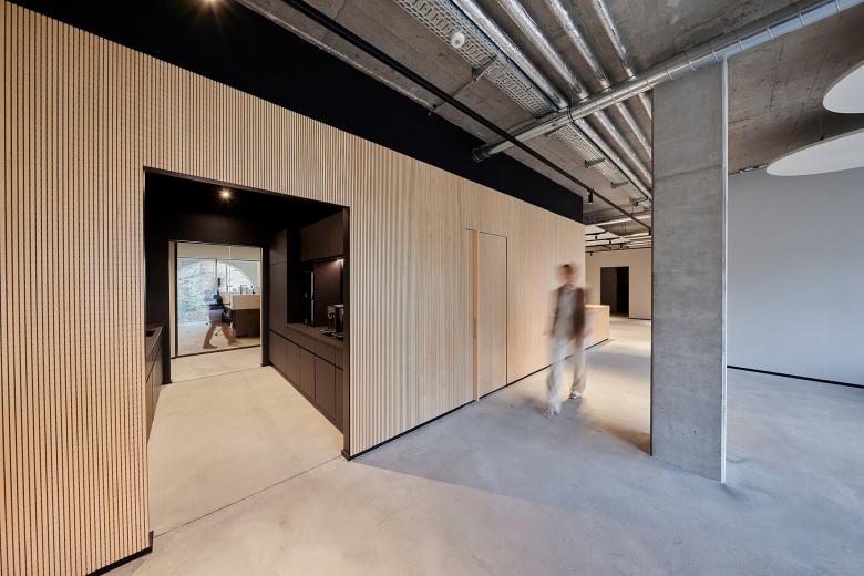 Die Architekten von Mint Architecture Frankfurt gestalten den Innenausbau auf Grundlage des weitgehend im Rohbau belassenen Gebäudes und schaffen durch eine kontrastreiche Materialisierung und Farbgebung ein Loft ähnliches Ambiente. Die sichtbaren, technischen Grundinstallationen an der Decke liefern farbliche Akzente, während die weißen Deckensegel – wirksam als Heiz-Kühl-Elemente und als Schallabsorber – durch ein schwarzes Schienensystem mit integrierten Beleuchtungskörpern unterbrochen werden. Glastüren, die von schwarzen Stahlprofilen eingerahmt sind, eine schwarz-weiße Einrichtung sowie helle Sichtbetonwände und Bodenbeläge bilden einen Kontrast zu den warmen Holzelementen und der innenliegenden, schwarz gestalteten Küche und den Nischen.