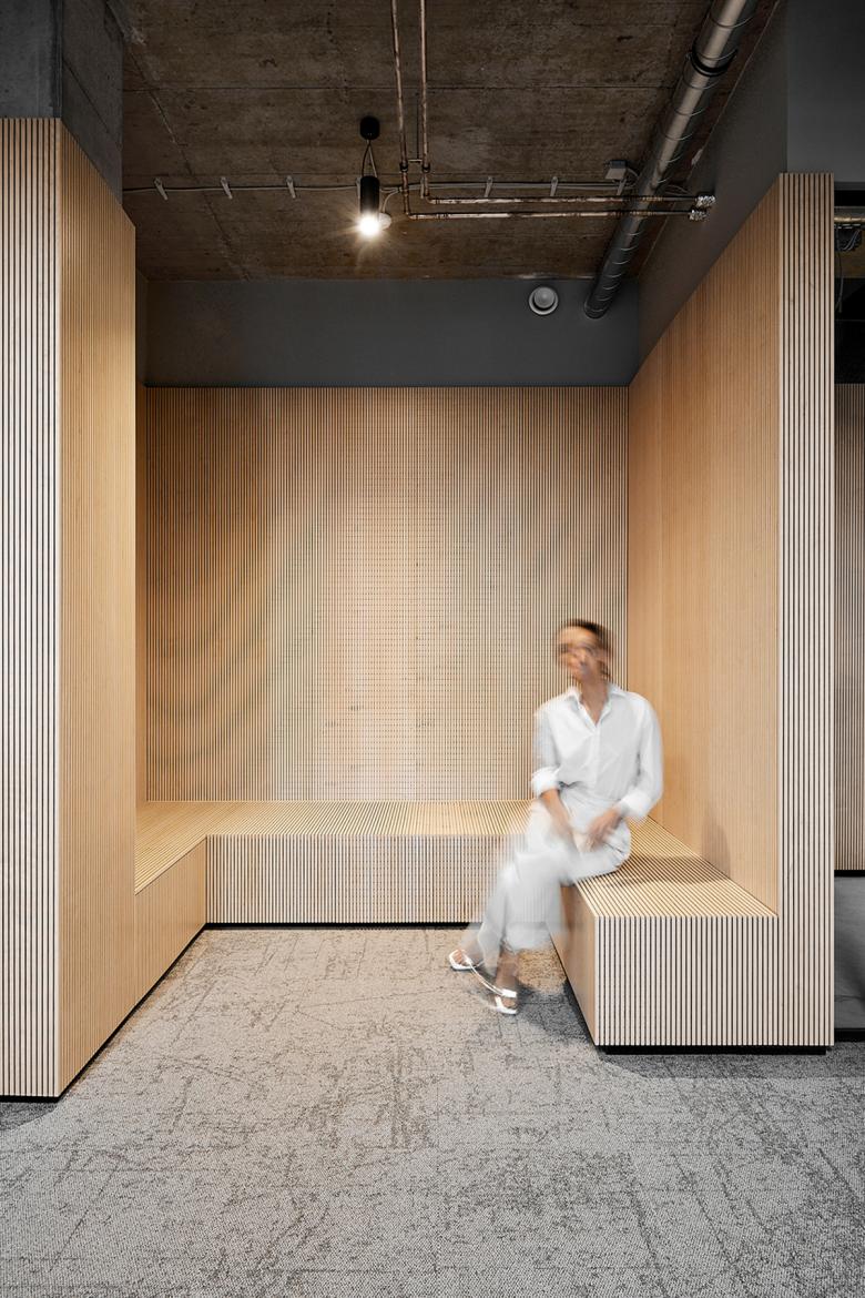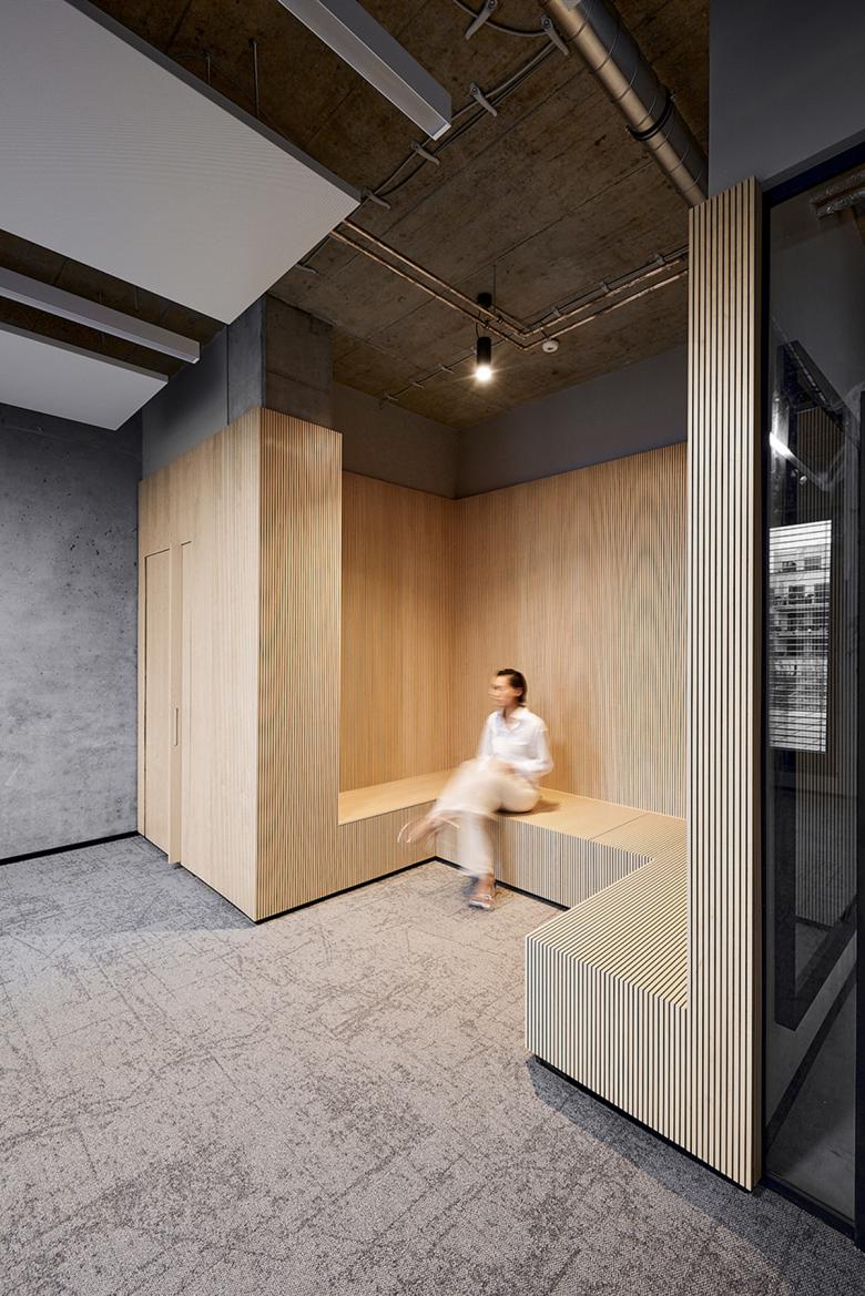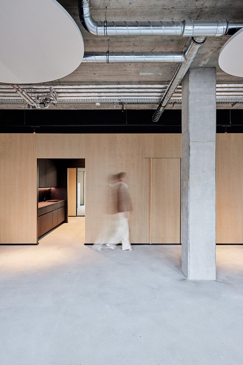 Beständigkeit und Kontinuität haben bei der Creditreform Tradition. Mint Architecture übersetzt die Grundhaltung der Gruppe in die Innenarchitektur und entwirft sowohl hinsichtlich Nutzung als auch Materialisierung eine nachhaltige Arbeitswelt. Der Raum erhält durch einen innenliegenden Kern, an den im Eingangsbereich eine skulpturale Sitzbank anschließt, einen markanten funktionalen und ästhetischen Charakter. Durch den Einsatz von hellem Birkenholz entsteht eine natürliche Atmosphäre, die im Kontrast zu den Wänden, Stützen und zur Decke aus Stahlbeton steht. Im Innern des Holzkerns befinden sich die Küche, sanitären Einrichtungen sowie abschließbare Stauräume. Um diesen inneren Holzbau herum sind auf der einen Seite die offenen Bürobereiche mit vier Arbeitsgruppen angeordnet. Auf der gegenüberliegenden nördlichen Seite mit Zugang zur durchgängigen Terrasse befinden sich die Besprechungsräume, der Begegnungsraum und Einzelbüros. Die Räume werden durch transparente Glasflurwände geschlossen und ermöglichen allen Mitarbeiterenden den Blick auf den Außenbereich.