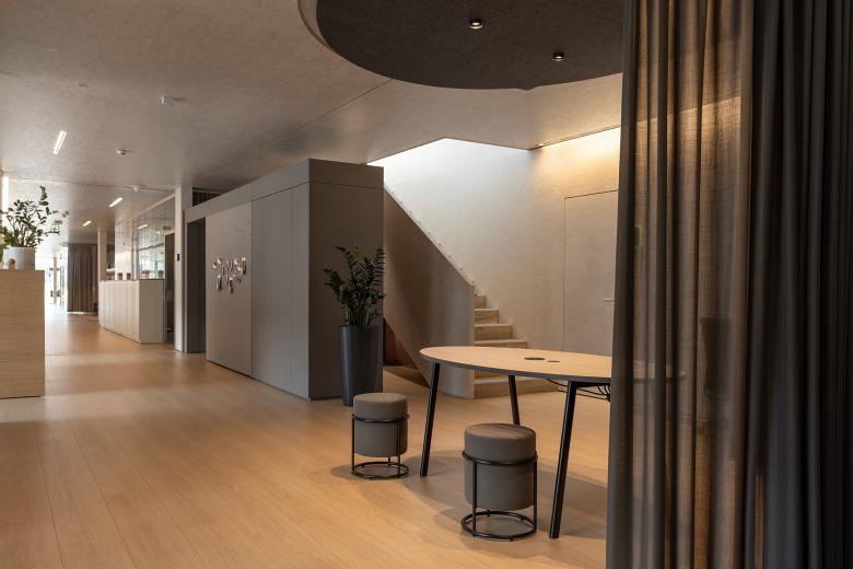 Das Team von Mint Architecture übersetzt die Werte des Unternehmens in die Innenarchitektur und schafft durch den Einsatz der hochwertigen Egger Materialien eine perfekte Symbiose mit der raumdefinierenden Architektur. Das Bestandsgebäude ist auf einem klaren Raster und modularen System mit eigenen OSB-Platten gebaut. Bei der neuen Arbeitsumgebung wurden Zwischenwände für die Gestaltung der neuen Open Space Fläche entfernt und neue Durchblicke und Sichtachsen geschaffen. Die klare und strikte Formensprache des Gebäudes wird mit runden Elementen, wie den bodenlangen Vorhängen, spielerisch und natürlich ergänzt.